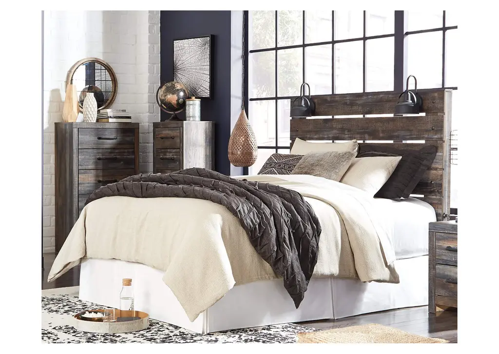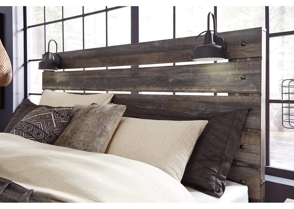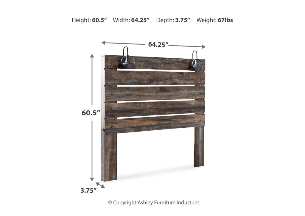 When merged in just the right way, rustic and industrial styles can make one happy marriage. Case in point: the Drystan queen panel headboard. A refined take on barn board beauty, its complex, replicated wood grain showcases hints of burnt orange and teal tones for a sense of weatherworn authenticity. Love to read in bed? You’re sure to find the pair of retro-chic light sconces and USB plug-ins on the open-slat style headboard such a bright idea. Weight 75.000 lbs. (33.75kgs.)