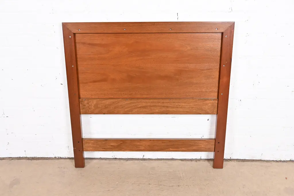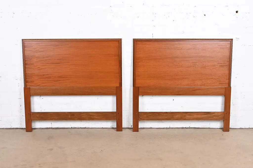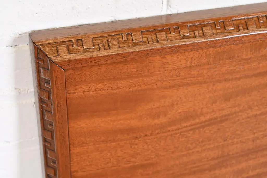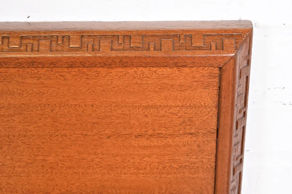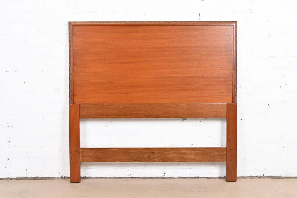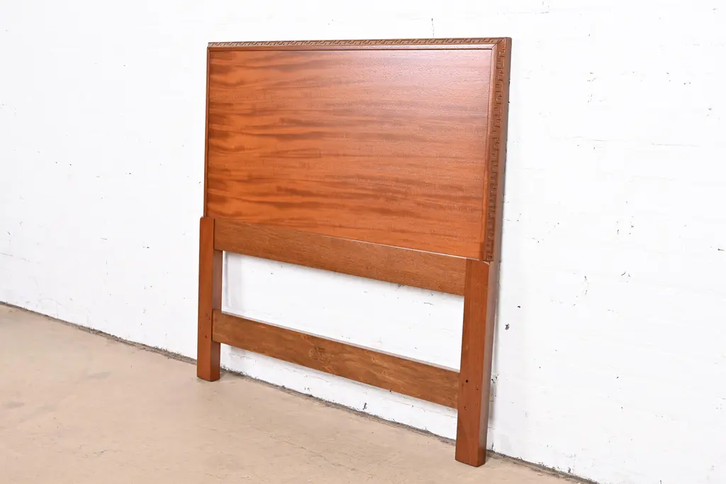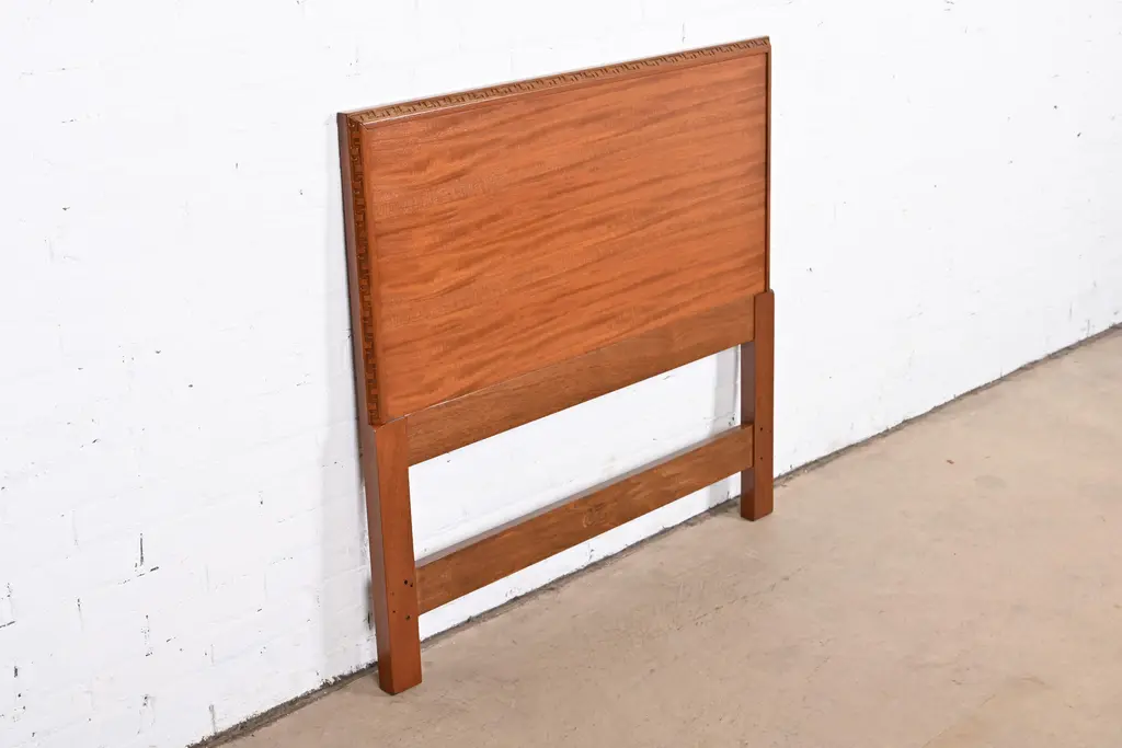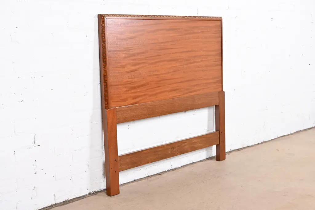 A rare and exceptional Mid-Century Modern "Taliesin" twin headboard By Frank Lloyd Wright for Heritage Henredon USA, 1950s Mahogany, with iconic carved geometric Taliesin detailing. Measures: 40" W x 1.5" D x 38.25" H. Professionally refinished. Excellent condition. Two matching headboards available. Price is per each.
