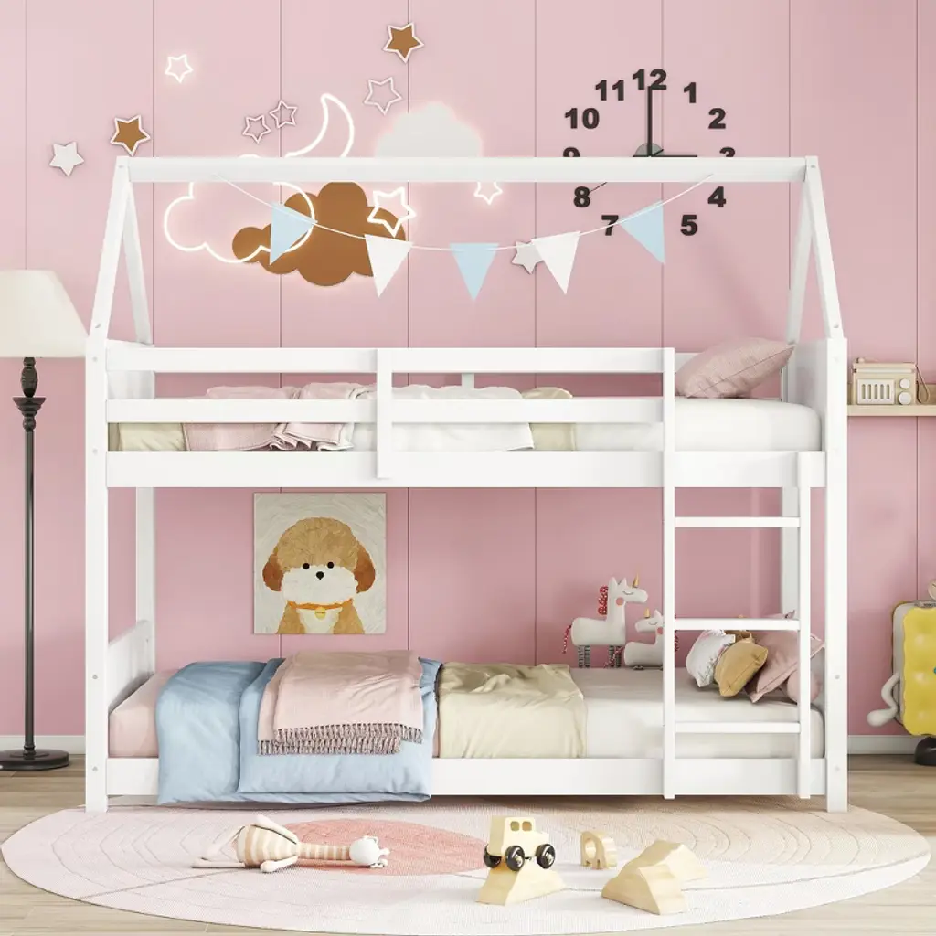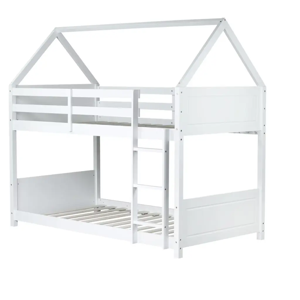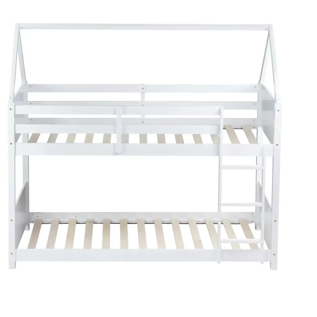 Gulches White Twin Over Twin Wooden House Floor Bunk Bed merges charm and reliability. Its unique house-shaped roof offers decor space for personalization; classic grooved headboards/footboards boost aesthetics and stability. Low height enhances safety, while a wide-step ladder eases climbing. Crafted from premium rubber wood with slat support for durability. Ships in one package with manual/hardware for easy assembly. Fits standard twin mattresses (not included).