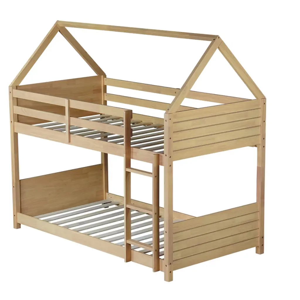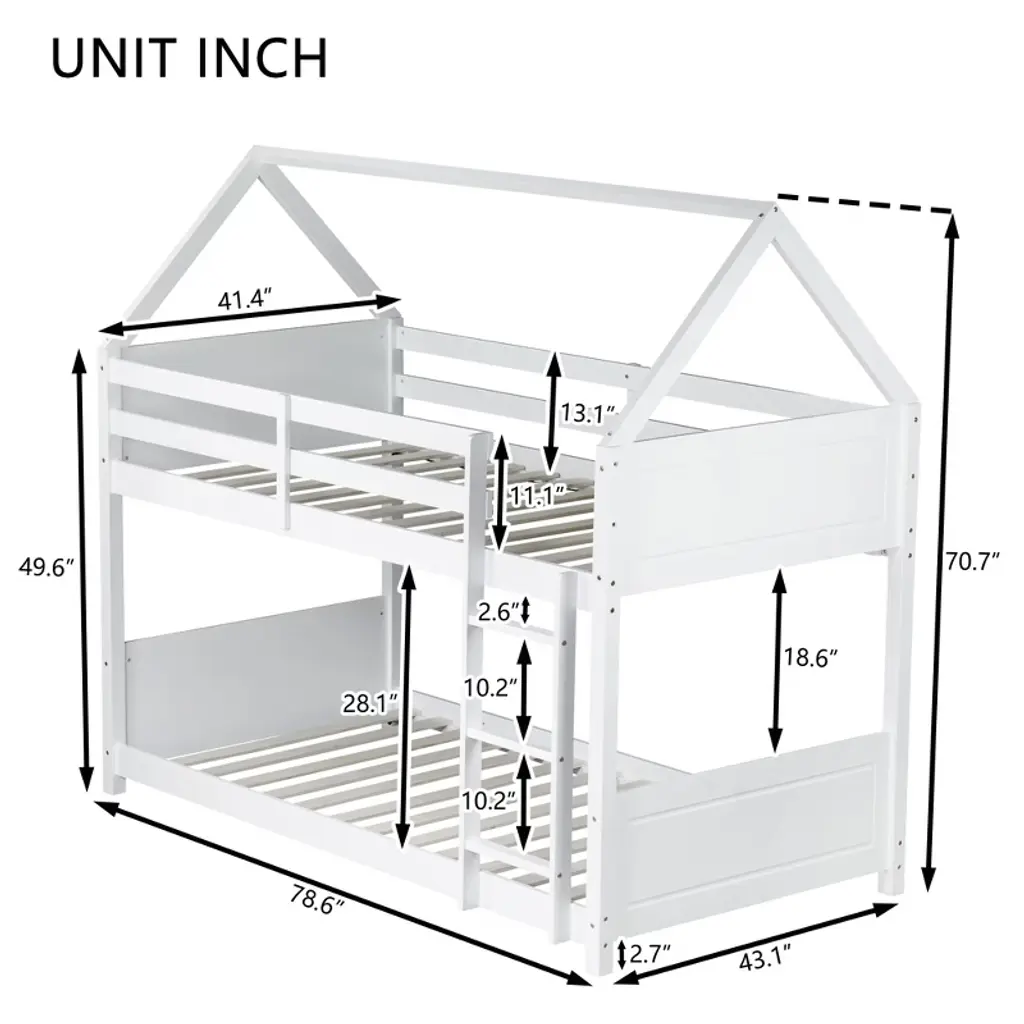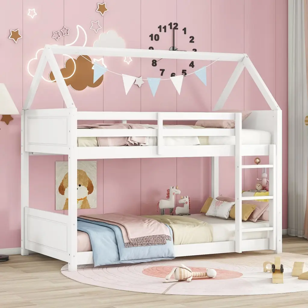 Gulches White Twin Over Twin Wooden House Floor Bunk Bed merges charm and reliability. Its unique house-shaped roof offers decor space for personalization; classic grooved headboards/footboards boost aesthetics and stability. Low height enhances safety, while a wide-step ladder eases climbing. Crafted from premium rubber wood with slat support for durability. Ships in one package with manual/hardware for easy assembly. Fits standard twin mattresses (not included).