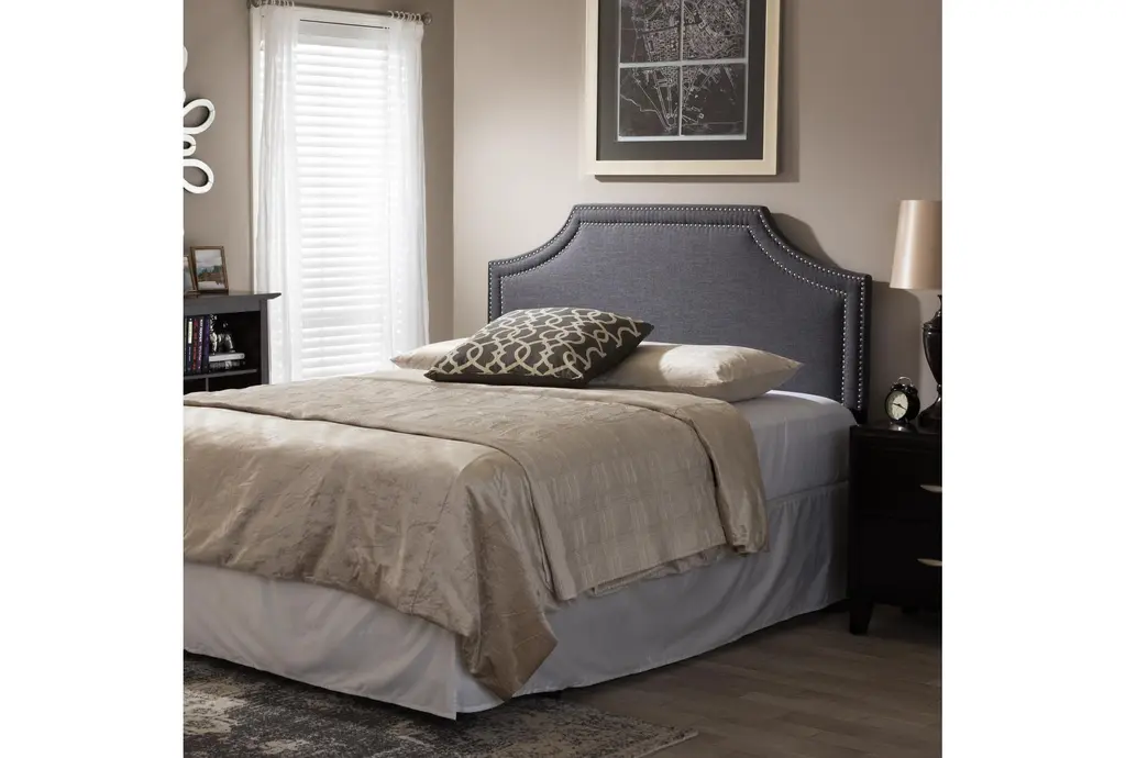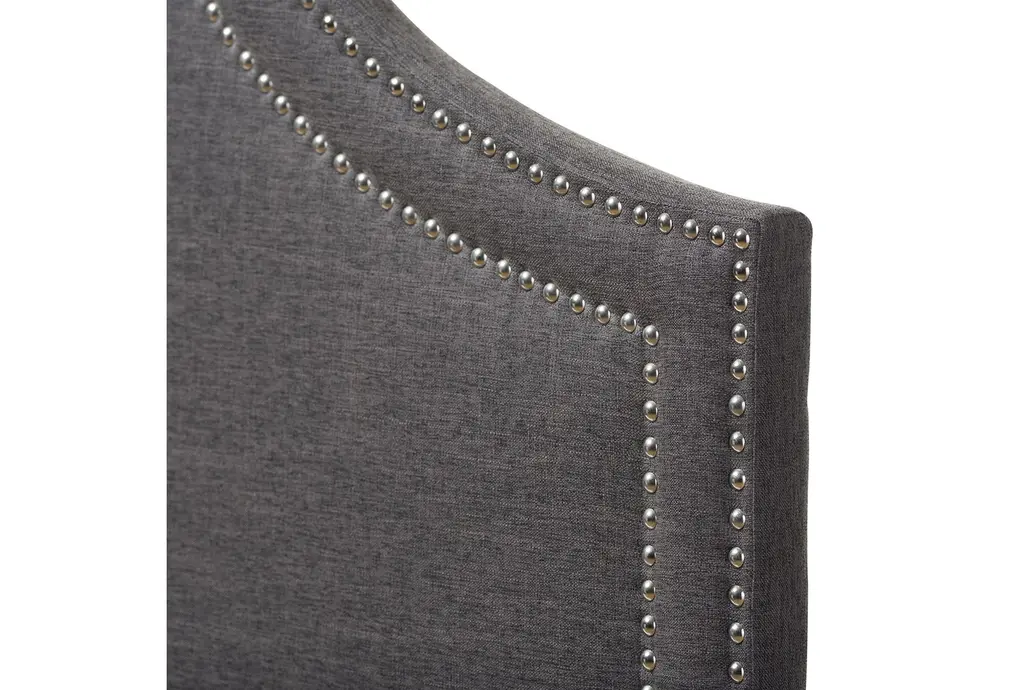 Enhance your bedroom with the Hayleigh King Dark Grey Natural Fabric Upholstered Headboard. Featuring a modern design, this headboard is upholstered in dark grey fabric with nailhead accents, providing a stylish focal point for your sleeping space.