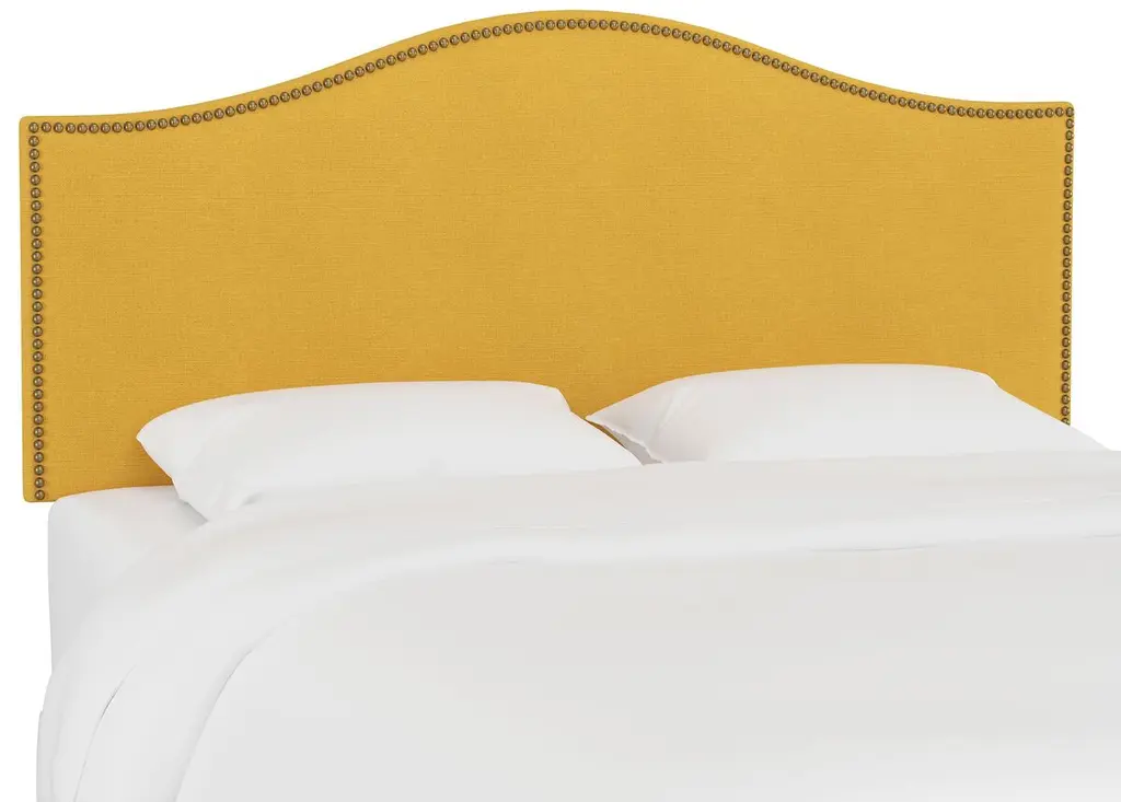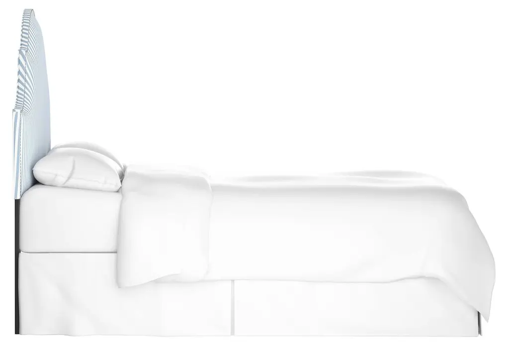 Traced in decorative nailheads, this elegant headboard boasts a seductive silhouette and neat linen-blend upholstery with blue and ivory stripes. Generous padding provides a soft, sturdy backdrop for reading and relaxing in bed. This easy-to-assemble headboard has metal legs which attach to any standard bed frame. Handcrafted in the USA.