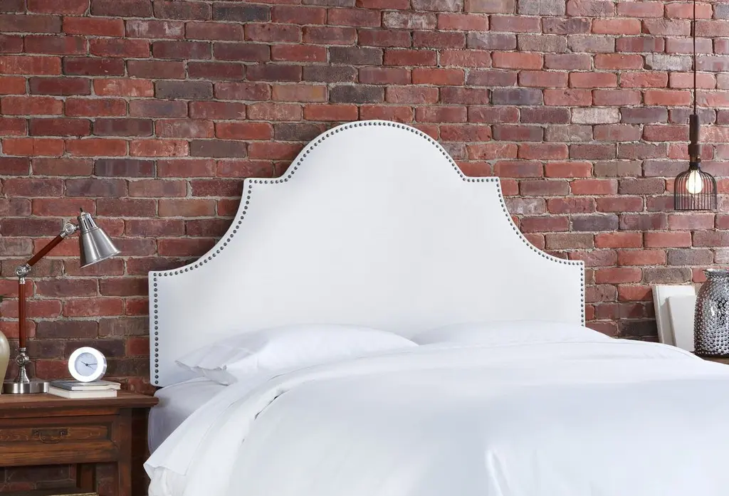 The pewter nailhead trim accentuates not only the dramatic silhouette of this headboard but also the luscious, velvety texture of the white upholstery. Attaches to any standard bed frame. Handcrafted in the USA.