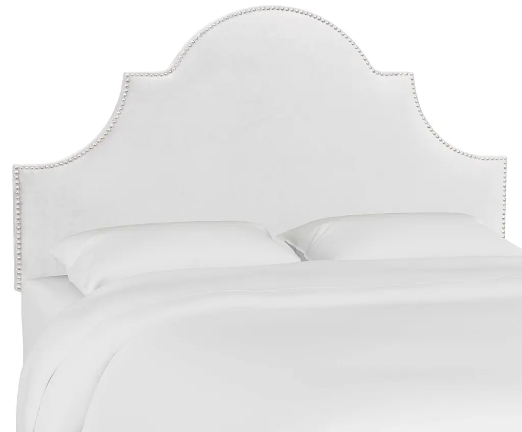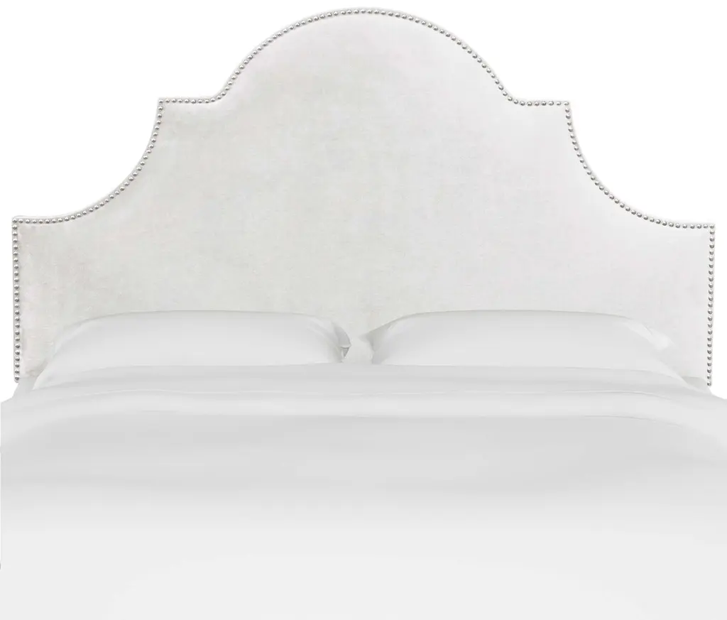 The pewter nailhead trim accentuates not only the dramatic silhouette of this headboard but also the luscious, velvety texture of the white upholstery. Attaches to any standard bed frame. Handcrafted in the USA.
