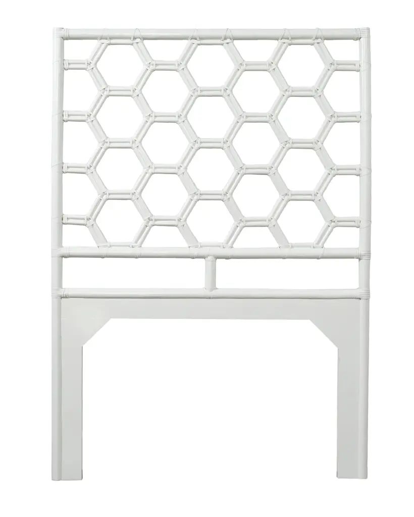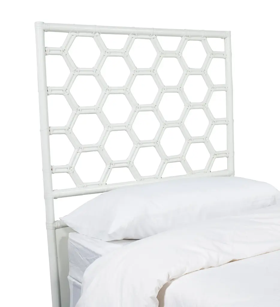 This headboard features classic Rattan design in a geometric pattern. Constructed of solid rattan and hand bound with rawhide bindings. This headboard can be attached to any standard bed frame or hung on the wall. Each headboard is hand finished in the USA and made to order, please allow time for delivery.