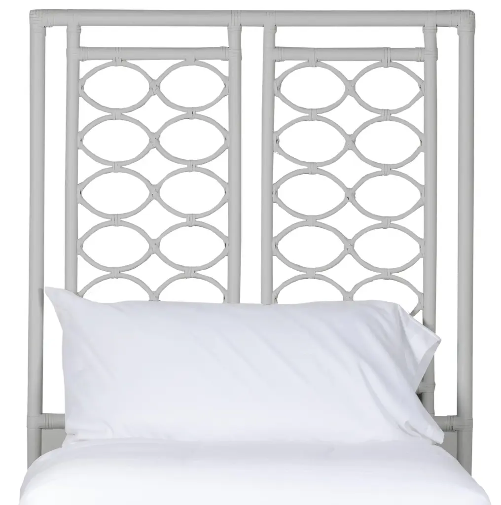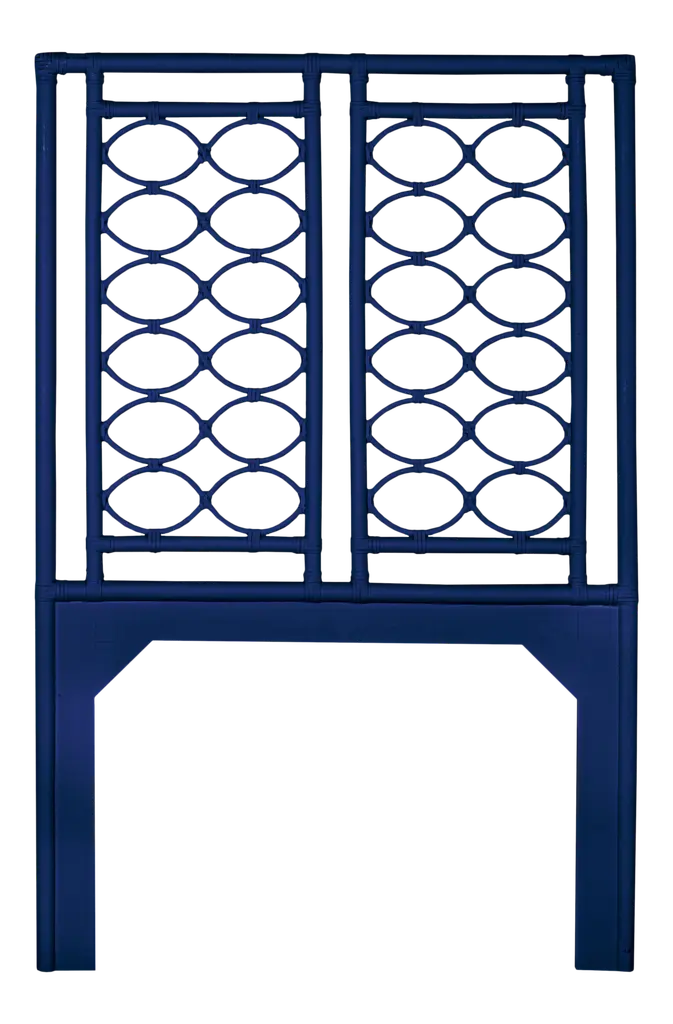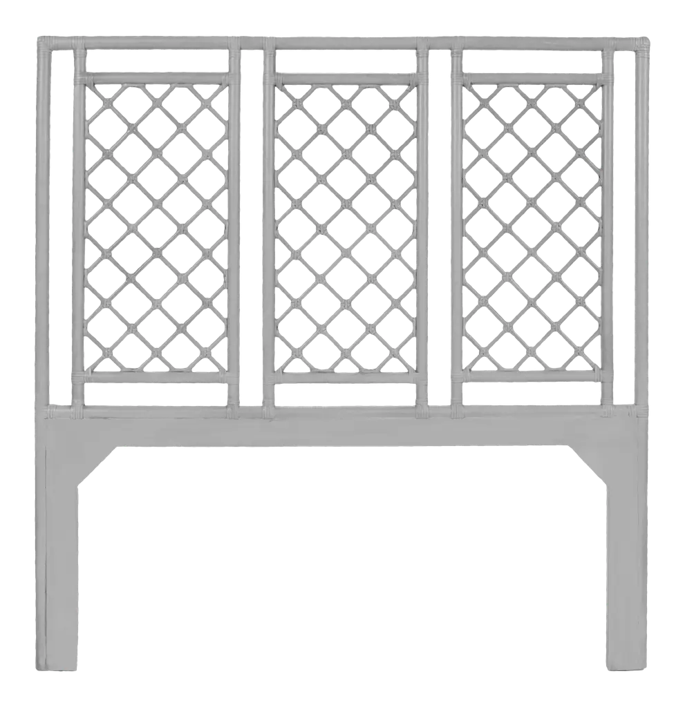 This headboard features classic Rattan design in a geometric pattern. Constructed of solid rattan and hand bound with rawhide bindings. This headboard can be attached to any standard bed frame or hung on the wall. Each headboard is hand finished in the USA and made to order, please allow time for delivery.