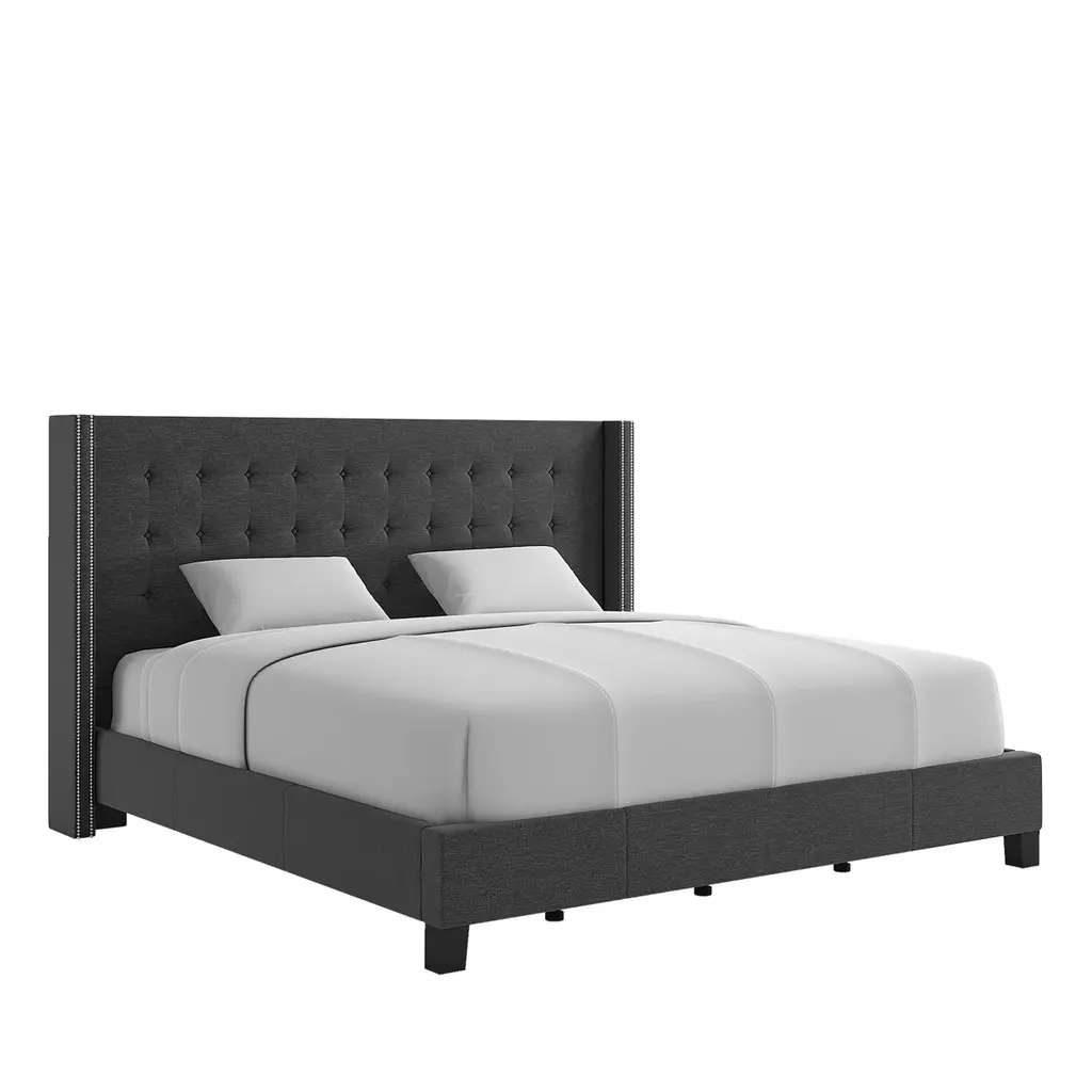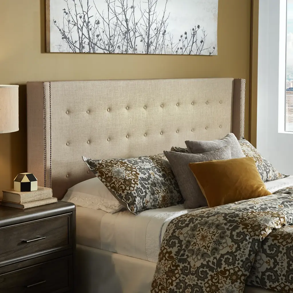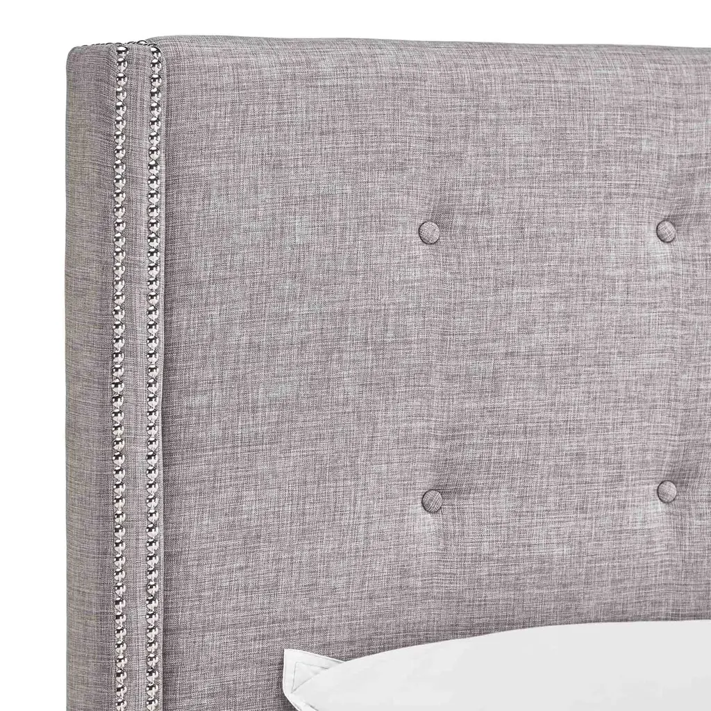 About This Product Whether the spot to lean against during a late-night read-a-ton or just a piece for keeping your pillows from slipping behind your bed, a headboard like this is great for updating your bedroom with glam style. It's built on a solid and manufactured wood frame and strikes a tall rectangular silhouette with shallow wingback arms. Enveloped in brushed linen upholstery, it features button tufting for a tailored touch, while gleaming nailhead trim lines the wing-back. Foam cushioning rounds out the design for a soft, comfortable finish. This headboard is designed to accommodate standard metal bed frames. Features Includes one (1) headboard only Wingback design for a vintage look Plush button tufting Soft, linen upholstery Delicate nailhead trim Connects to a standard bed frame (not included) Require "headboard adapter kit" (not included) to attach to the existing bed frame