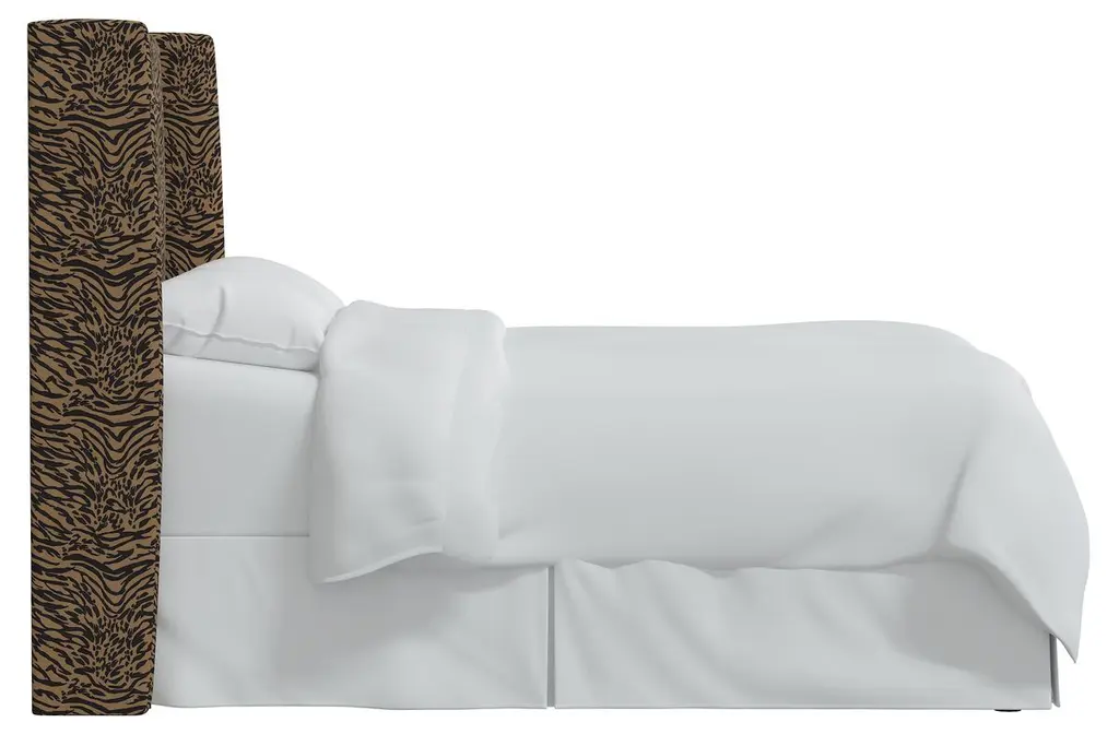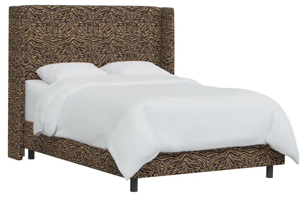 Exclusive to One Kings Lane: Tiger-print upholstery brings timeless glamour to this wingback headboard. Generous padding ensures comfortable support when reading or watching TV in bed. Made in the USA, the headboard has metal legs that easily attach to any standard bed frame.