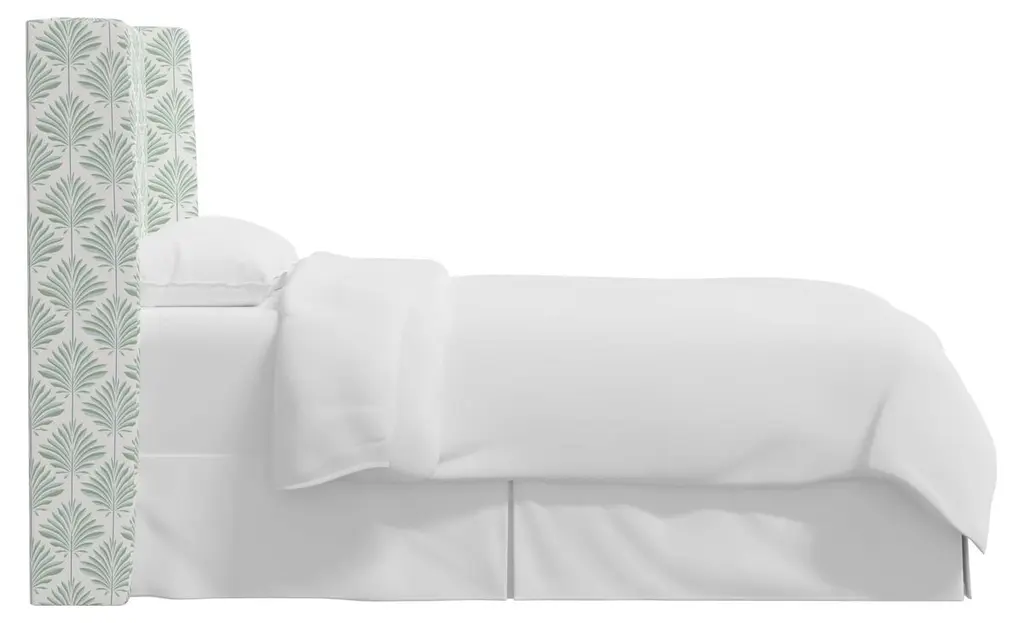 Exclusive to One Kings Lane and made in the USA: The graceful fanlike leaves of the cerifera palm inspired the upholstery of this equally graceful wingback headboard. Generous cushioning provides comfort and support while you're reading or watching TV.