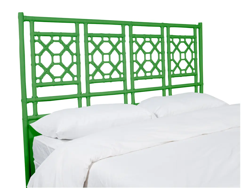This headboard features classic Rattan design in a geometric pattern. Constructed of solid rattan and hand bound with rawhide bindings. This headboard can be attached to any standard bed frame or hung on the wall. Each headboard is hand finished in the USA and made to order, please allow time for delivery.