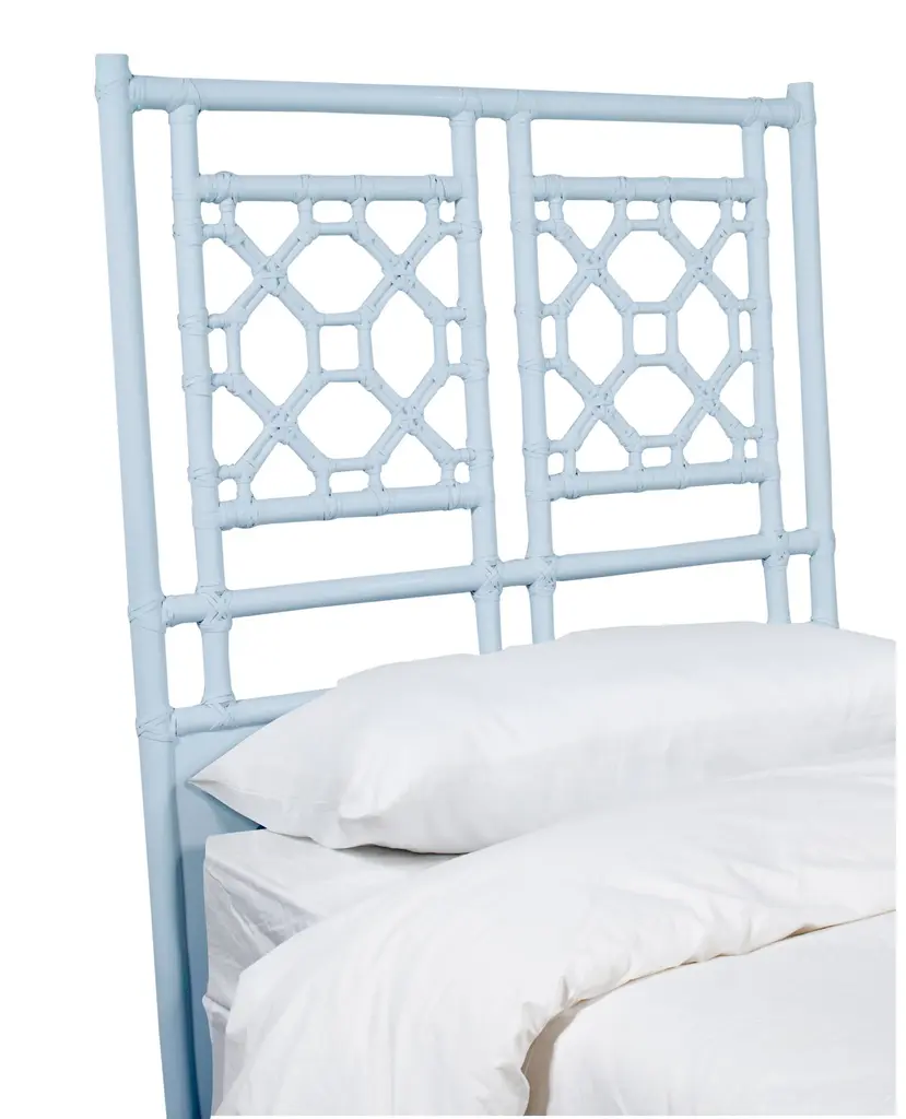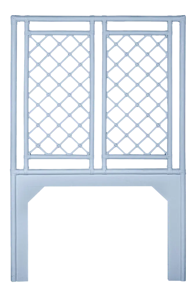 This headboard features classic Rattan design in a geometric pattern. Constructed of solid rattan and hand bound with rawhide bindings. This headboard can be attached to any standard bed frame or hung on the wall. Each headboard is hand finished in the USA and made to order, please allow time for delivery.