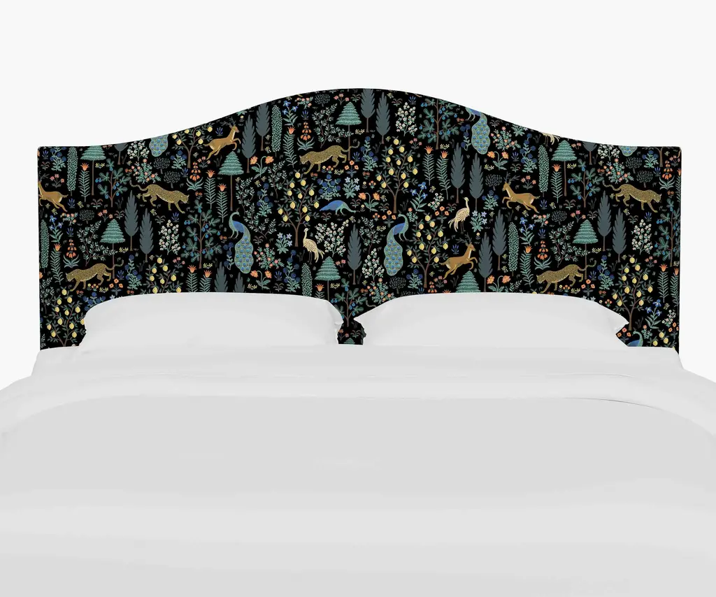 A headboard with classic curved lines, designed to mount to your existing bed frame. Select from 17 illustrated fabrics for your made-to-order piece, crafted in Chicago by Cloth & Company.