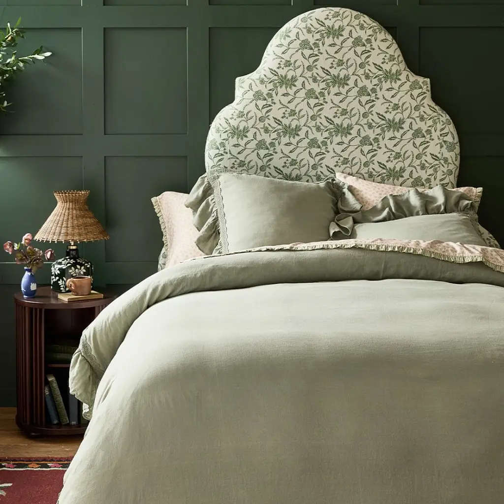 Green leaves. Warm breeze. A dream of flowers. In 100% cotton with an FSC®-certified solid wood frame and natural latex fill, this upholstered, scroll-shaped headboard is dreamy, indeed.