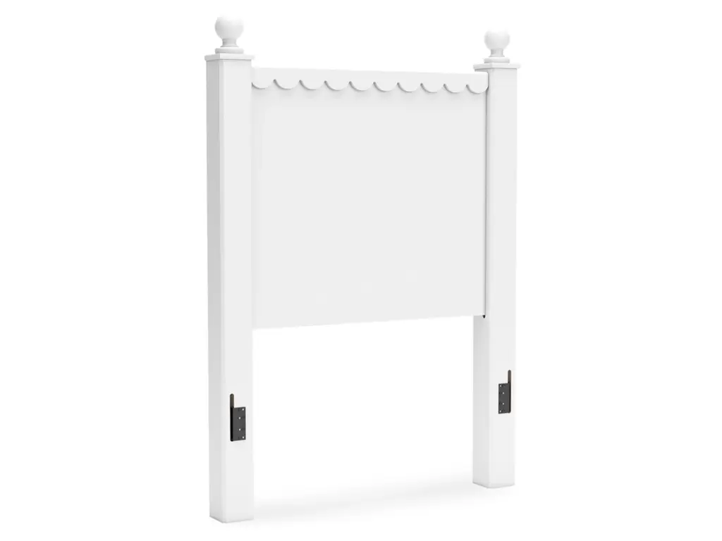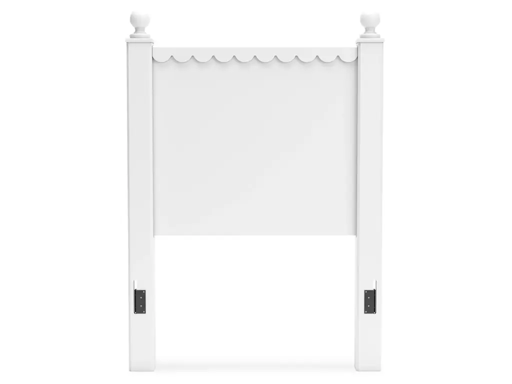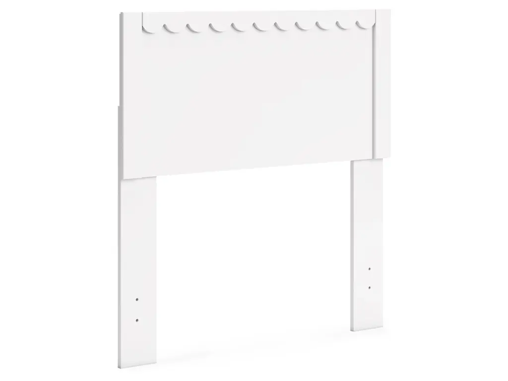 Make morning or bedtime that much more magical with the Mollviney twin panel headboard. Charmingly cute with its scalloped detailing, it appeals to both her sense of playful whimsy and your love for modern design. And the headboard's crisp white finish gives you the versatility to pair it with existing decor.