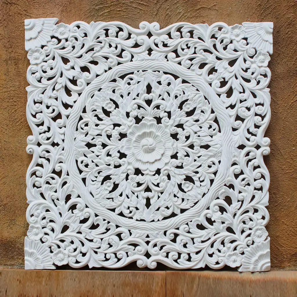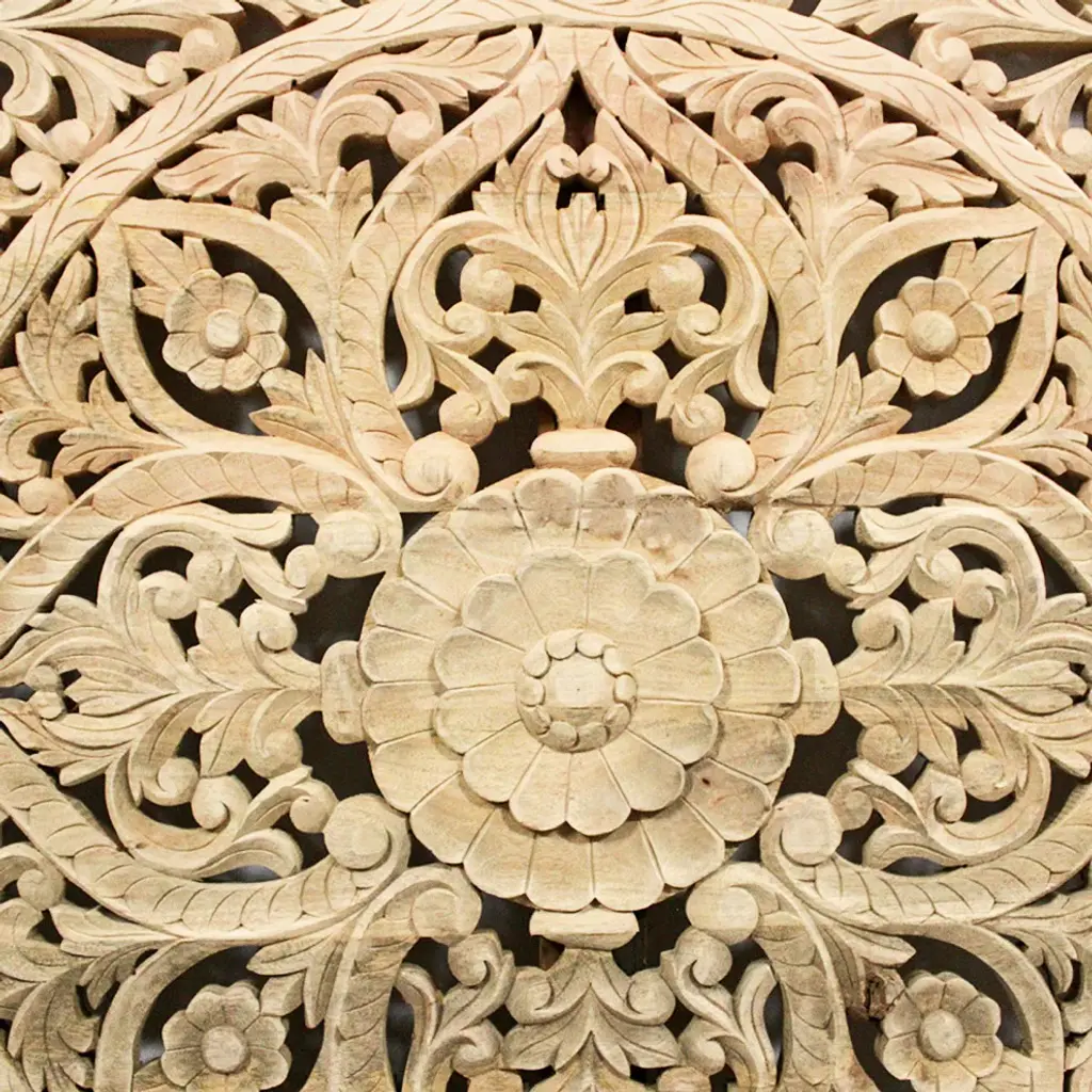 Hand carved lotus medallion square carved panel beautiful design in raw wood ready to be stained or painted for art work or headboard. Each may have variations in natural and handmade differences including tones, grain, and inherent imperfections.