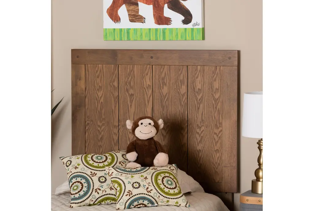 The Oaklee Twin Ash Walnut Finish Brown Natural MDF Wood Headboard is a modern and versatile addition to any kid's bedroom. Designed with a tall shape, it features a rich ash walnut color that brings warmth and natural beauty to your space. Its durable rubberwood and MDF veneer construction ensures lasting use and quality.