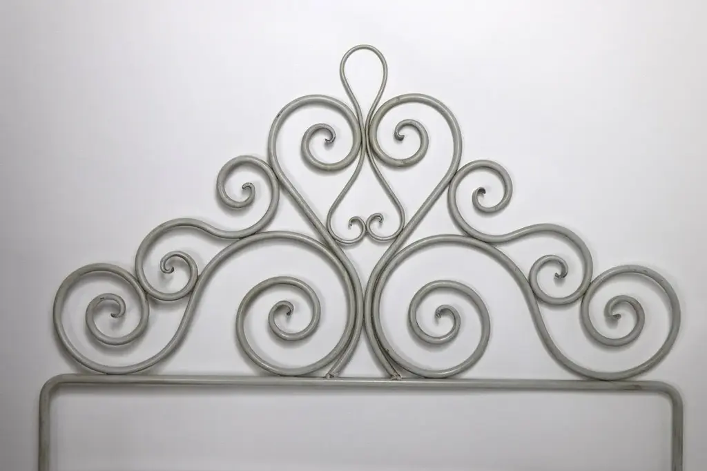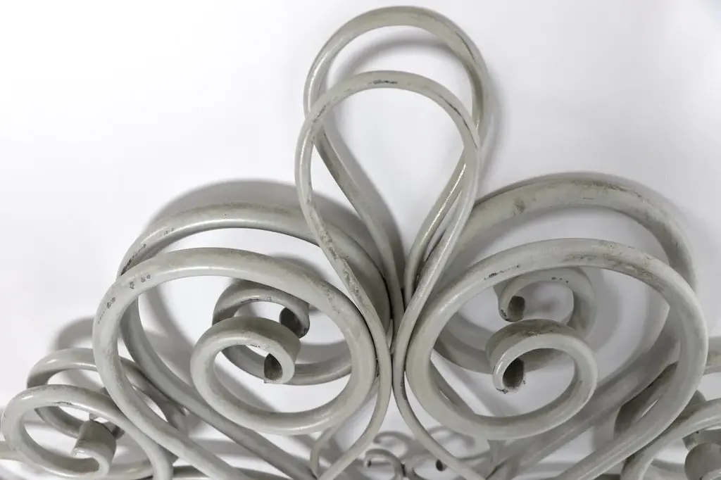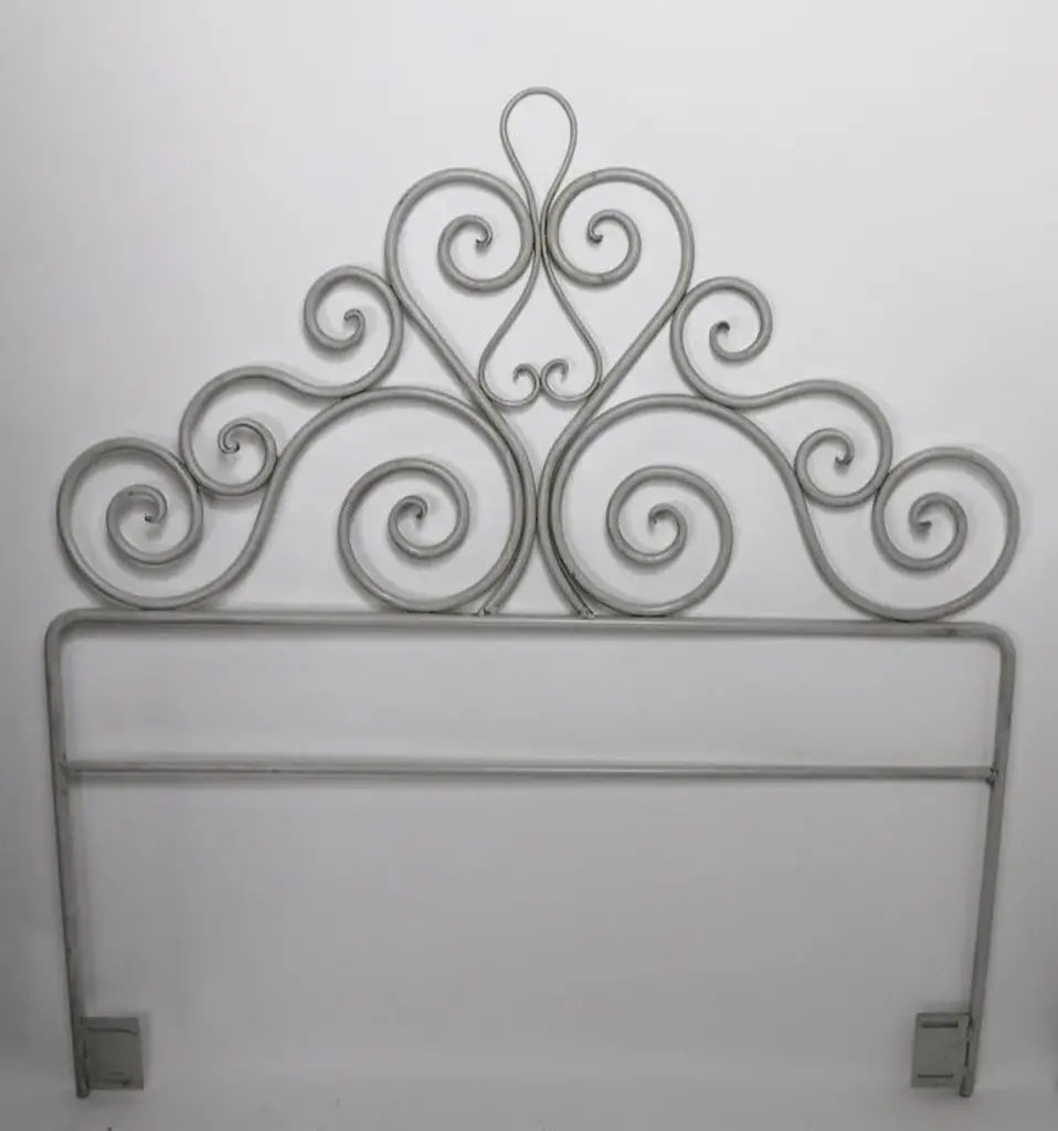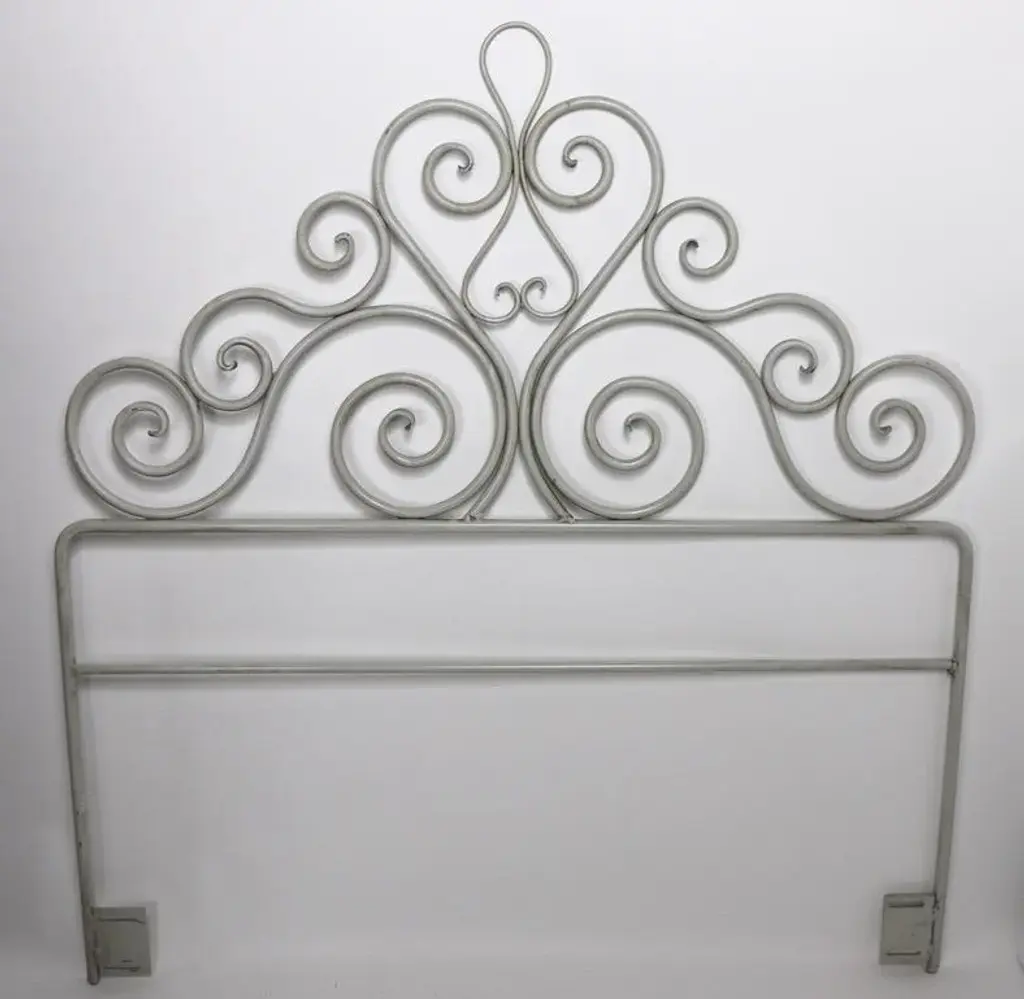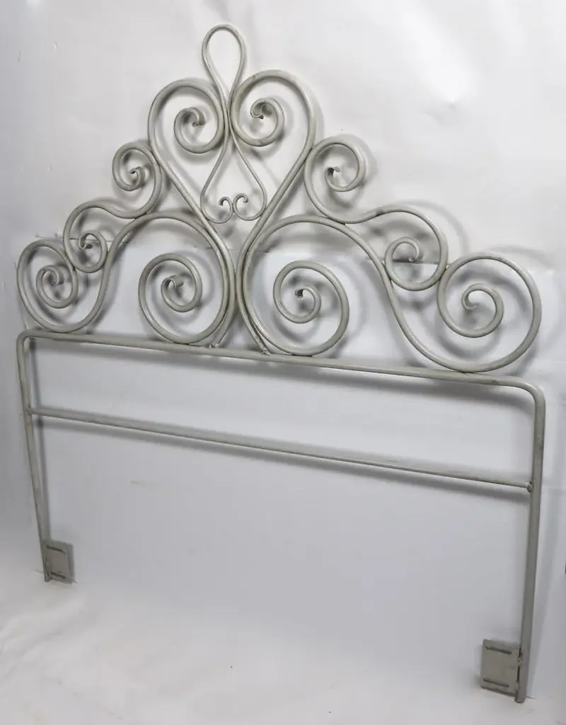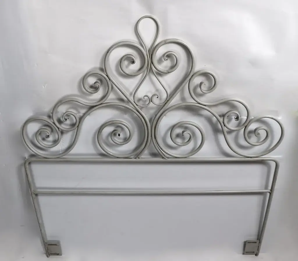 Well crafted pair of scrollwork wrought iron headboards suitable for twin size beds ( 44 inch total W. ) You can use these as two separate headboards by attaching a Hollywood frame to each, or create one bed / daybed by using one as a headboard and the other as a footboard. Priced and offered individually, but we would love to see them stay together. Height of decorative iron section of the bed 22 inch x total H 41 inch. Currently in original white paint finish, showing light cosmetic wear normal and consistent with age. We also offer custom powder coating if you prefer a more polished look.