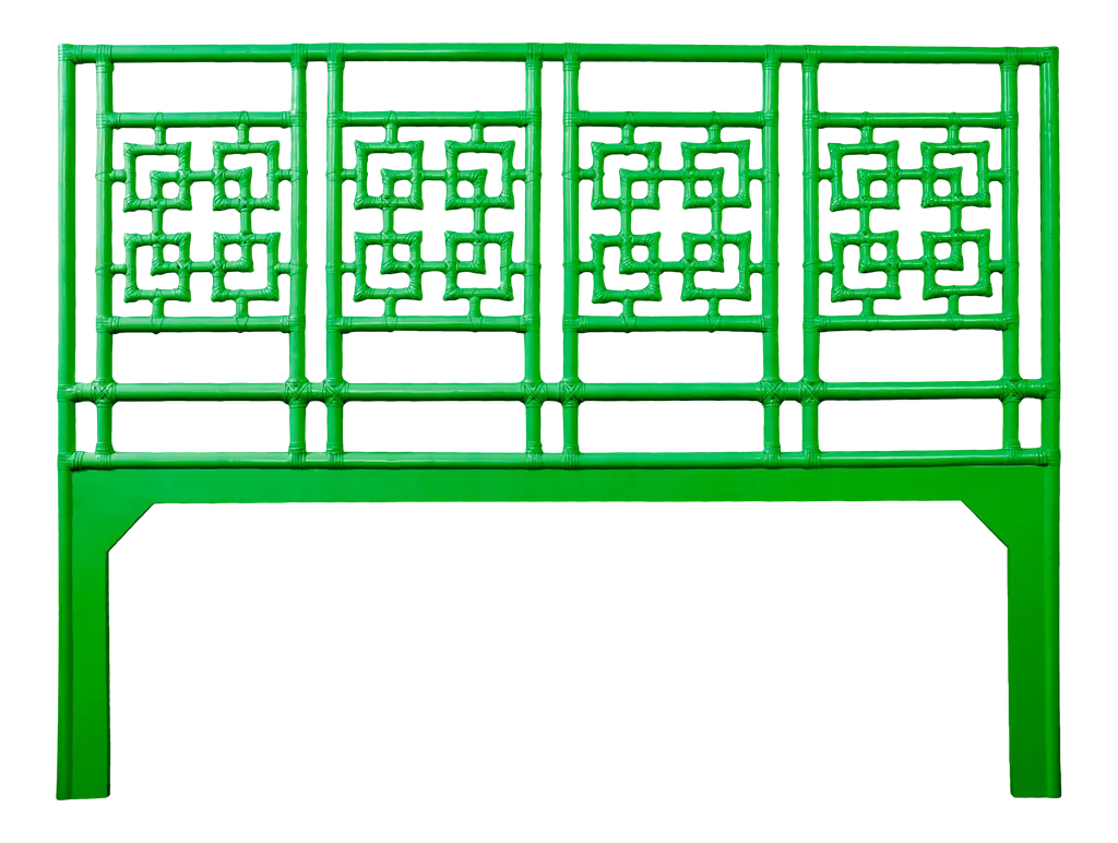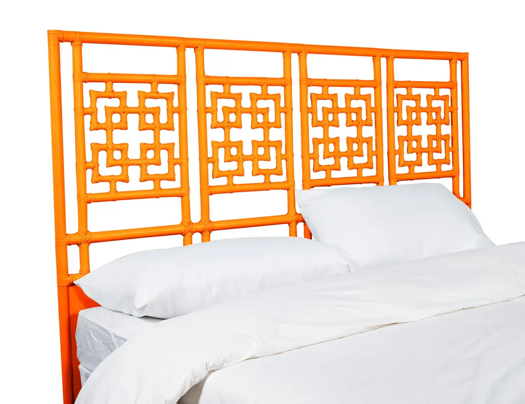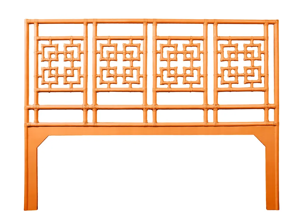 This headboard features classic Rattan design in a geometric pattern. Constructed of solid rattan and hand bound with rawhide bindings. This headboard can be attached to any standard bed frame or hung on the wall. Each headboard is hand finished in the USA and made to order, please allow time for delivery.