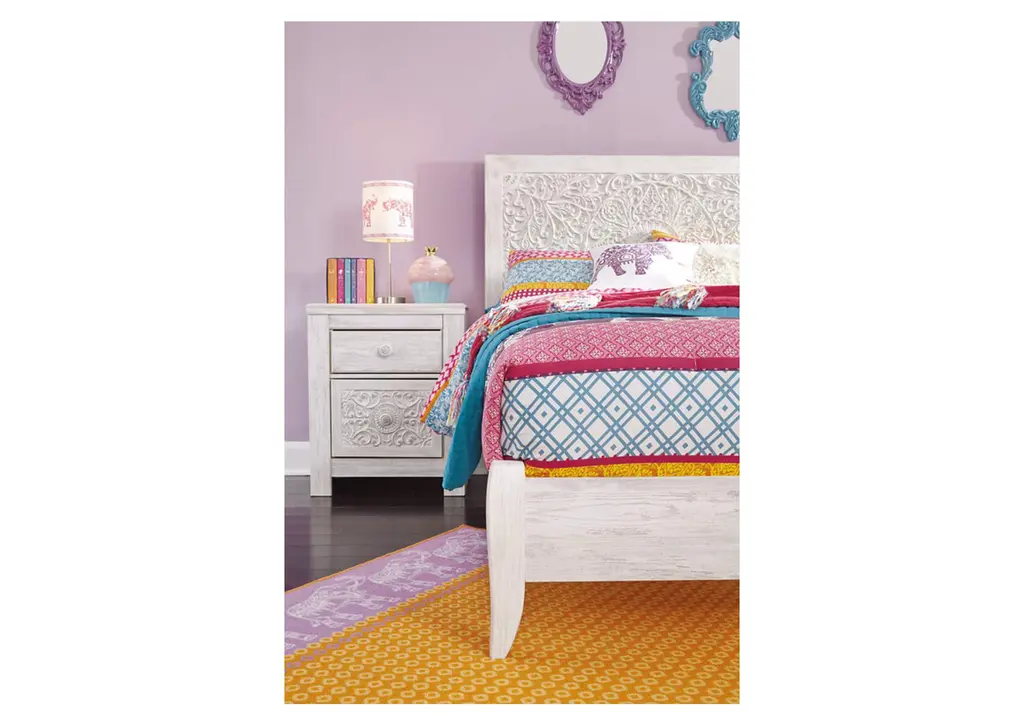 Your young trendsetter can live out her free spirit with the Paxberry full headboard. Exquisite carved medallion pattern is a testament to boho-chic style. Charming whitewashed finish sets a foundation for a room bursting with personality. Adjustable height design offers added flexibility. Weight 60.390 lbs. (27.18kgs.)