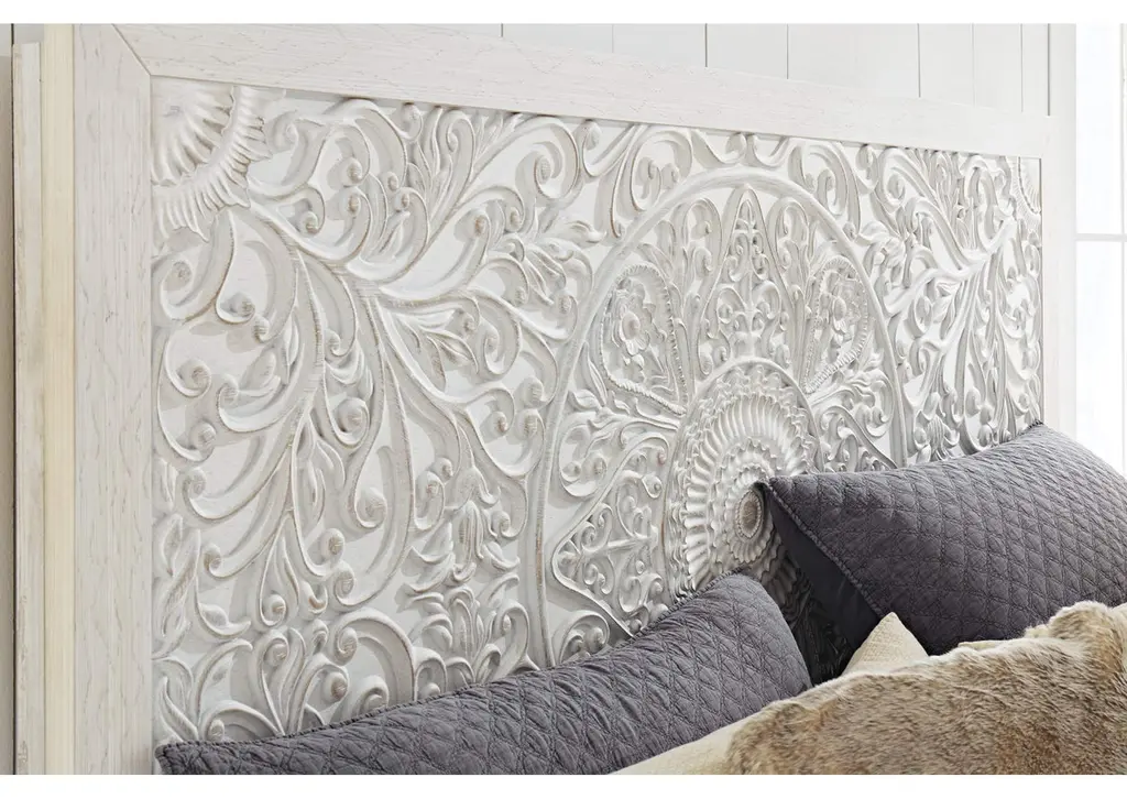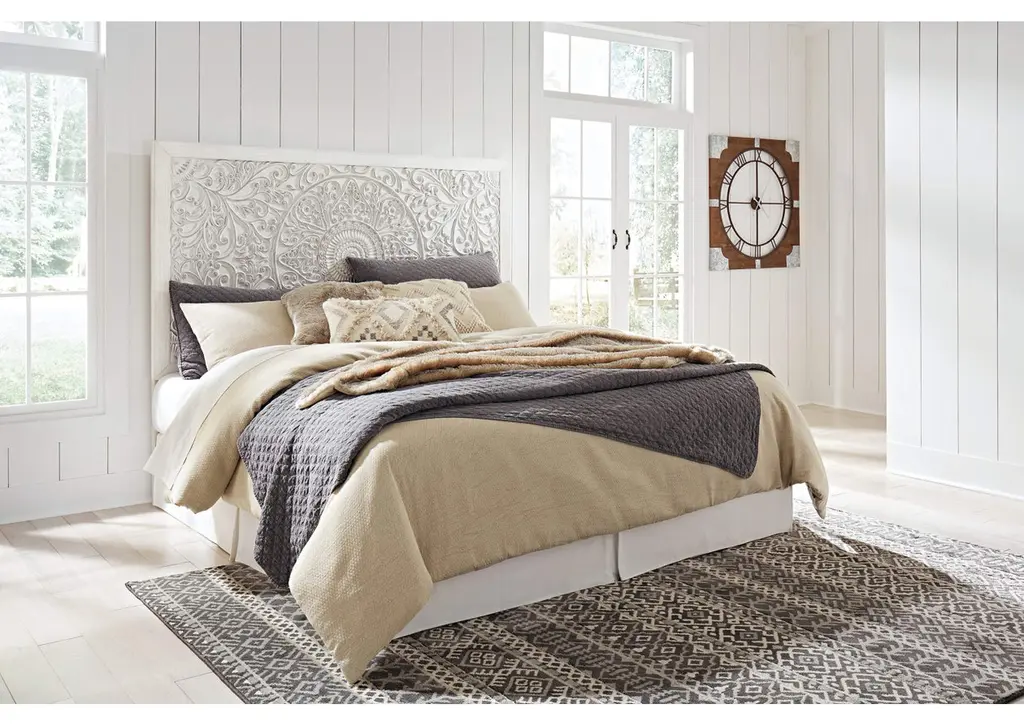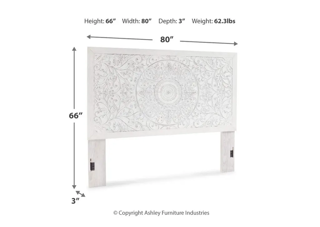 Live out your trendsetting free spirit with the Paxberry king headboard. Exquisite carved medallion pattern is a testament to boho-chic style. Charming whitewashed finish sets a foundation for a room bursting with personality. Adjustable height design offers added flexibility. Weight 62.300 lbs. (28.04kgs.)