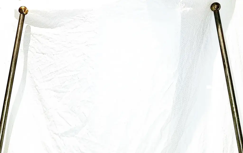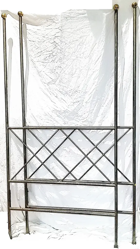Twin size polished steel 2-poster headboard in a polished pewter and slight oxidation finish to mount to your wall or use an adapter plate to mount to a metal frame. Solid brass finials (can be used without or easily paint to matching silver metal color). Sturdily built in the USA in the 1990s, we sold a queen size to Adrianna Vittadini and also Calvin Klein that was featured in an article on his Hamptons home in Elle Decoration, 1994, as pictured with sheers. This is a new-old stock from our warehouse, never offered or sold until now. An identical matching queen will be listed soon if needed. Two available-buy the pair to create an amazing 4 poster.