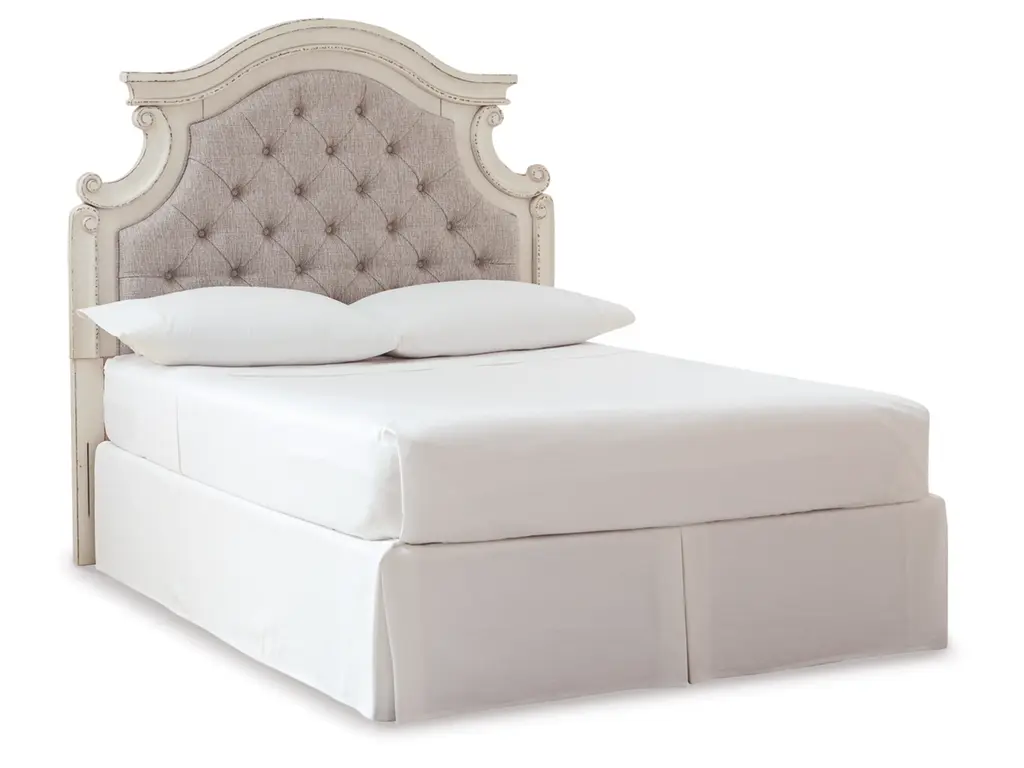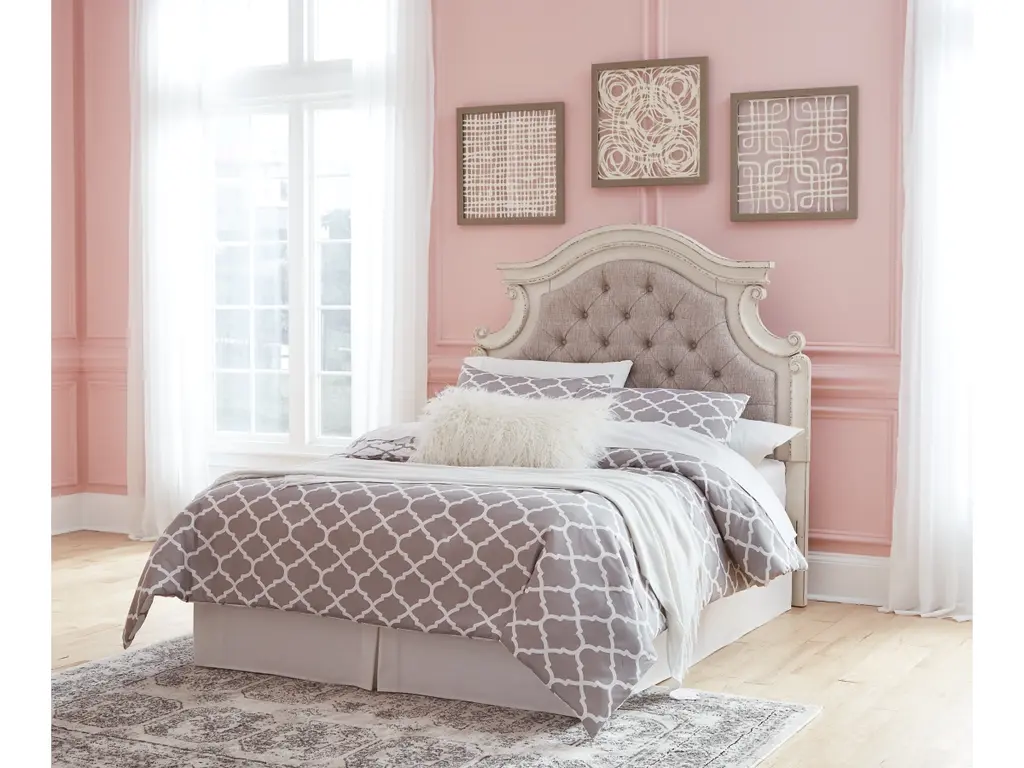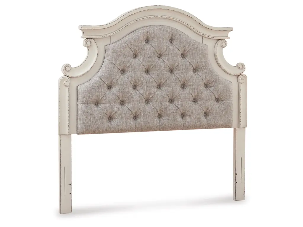 Redefining the art of traditional cottage styling, the Realyn full upholstered panel headboard is your dream bedroom retreat realized. The ornately shaped headboard with inset upholstered cushion brings cozy charm. Button tufting adds refinement, while a chipped white finish lends a classic touch.