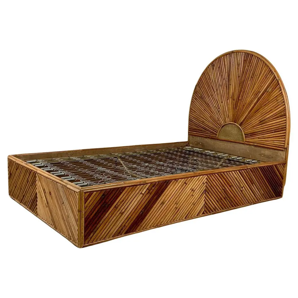 Beautifully restored stacked Streamline rattan twin-size bed frame with matching headboard fashioned after the stylings made famous by Paul Frankl blends style and vintage charm with modern comfort. The set includes a 15-strand stacked bedroom formed into one solid piece with a matching horizontally stacked rattan headboard. This set is emblematic of the Art Deco design shifting into the early Mid-century and will work timelessly in any modernist setting. All meticulously refinished to highlight the natural rattan’s warmth and durability. It is perfect for creating a stylish and cozy tropical coastal-inspired living space. In the style of Paul T. FranklPerfect for compact spaces, this bed frame is modeled after the smaller beds often found in the pre-war era. Please refer to the measurements, as this frame may require a custom-sized mattress. A modern-sized mattress that will fit inside: TwinSell for 1 Bedframe, 2 AvailableRattan is more than just furniture—it's a statement of style, uniqueness, and timeless elegance. Frequently featured in home design magazines and advertisements worldwide, rattan's appeal lies in its ability to blend classic charm with contemporary aesthetics effortlessly.We take pride in offering the finest rattan available, showcasing expert craftsmanship through meticulously restored pieces built to last. Every item in our collection is revitalized with precision—wrappings repaired, connections reinforced, and a durable protective finish applied. Paired with fresh, perfectly fitted cushions, our rattan furniture delivers unparalleled comfort and beauty for your home or workspace. We have almost 100 years of expertise and know how to properly refinish and fully strengthen your rattan furnitureOur high-resolution photos capture the flawless condition and timeless style of each piece, highlighting rattan's enduring quality. With furniture that has stood the test of time—lasting 60 to 100 years—and now expertly restored to endure another 75, our collection represents both heritage and innovation. Stylish, unique, and versatile, rattan furniture remains a timeless choice, perfect for any setting.Harvey Schwartz is the leading expert in vintage rattan and the author of "Rattan Furniture: Tropical Comfort Throughout the Home." Signed copies are available for 39.99 USD. The hardbound 160-page full-color book details the fascinating History of rattan with photos of wonderful vintage and modern-day tropical décors and rattan. The book is great for any newcomer to rattan wanting to learn, as well as a top resource for dealers and designers alike.We fully guarantee your complete satisfaction!Dimensions: Height: 16" X Width: 41" X Length: 77"Mattress Size: Height: 7.5" X Width: 38" X Length: 74"United States, 1940