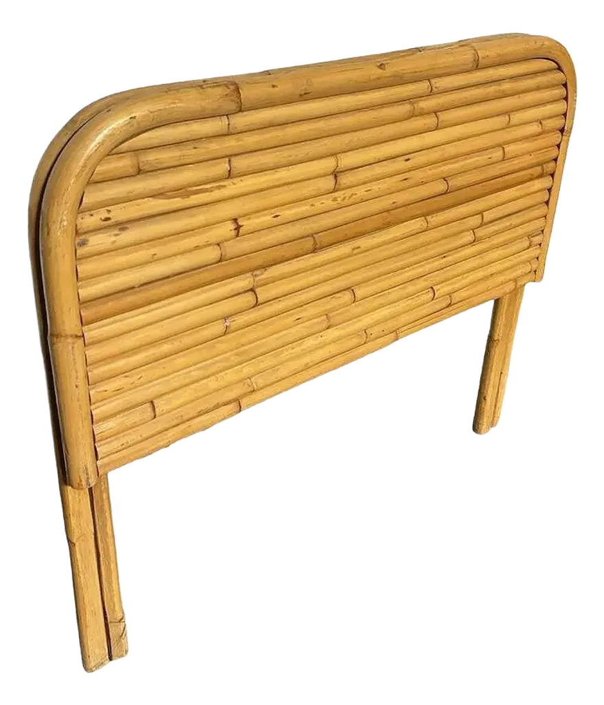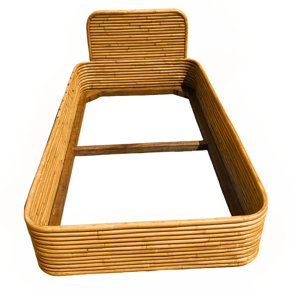 This beautifully restored, stacked Streamline rattan twin-size bed frame with matching headboard is fashioned after the stylings made famous by Paul Frankl blending style and vintage charm with modern comfort. The set includes a 12-strand stacked bedroom formed into one solid piece with a matching horizontally stacked rattan headboard. This set is emblematic of the Art Deco design shifting into the early Mid-century and will work timelessly in any modernist setting. The whole piece was meticulously refinished to highlight the natural rattan’s warmth and durability. It is perfect for creating a stylish and cozy tropical coastal-inspired living space. In the style of Paul T. Frankl Sale for 1 bedframe, 2 Available A twin-sized mattress will fit inside the frame with a few inches of space. Fits Mattress Size: Height: 77" X Width: 40.5" X Side Height: 12" Modern-sized mattress that will fit inside: Twin- 38" x 75" Rattan is more than just furniture—it's a statement of style, uniqueness, and timeless elegance. Frequently featured in home design magazines and advertisements worldwide, rattan's appeal lies in its ability to blend classic charm with contemporary aesthetics effortlessly. We take pride in offering the finest rattan available, showcasing expert craftsmanship through meticulously restored pieces built to last. Every item in our collection is revitalized with precision—wrappings repaired, connections reinforced, and a durable protective finish applied. Paired with fresh, perfectly fitted cushions, our rattan furniture delivers unparalleled comfort and beauty for your home or workspace. We have almost 100 years of expertise and know how to properly refinish and fully strengthen your rattan furniture Our high-resolution photos capture the flawless condition and timeless style of each piece, highlighting rattan's enduring quality. With furniture that has stood the test of time—lasting 60 to 100 years—and now expertly restored to endure another 75, our collection represents both heritage and innovation. Stylish, unique, and versatile, rattan furniture remains a timeless choice, perfect for any setting. Harvey Schwartz is the leading expert in vintage rattan and the author of "Rattan Furniture: Tropical Comfort Throughout the Home." We fully guarantee your complete satisfaction! United States, 1940 Marcss