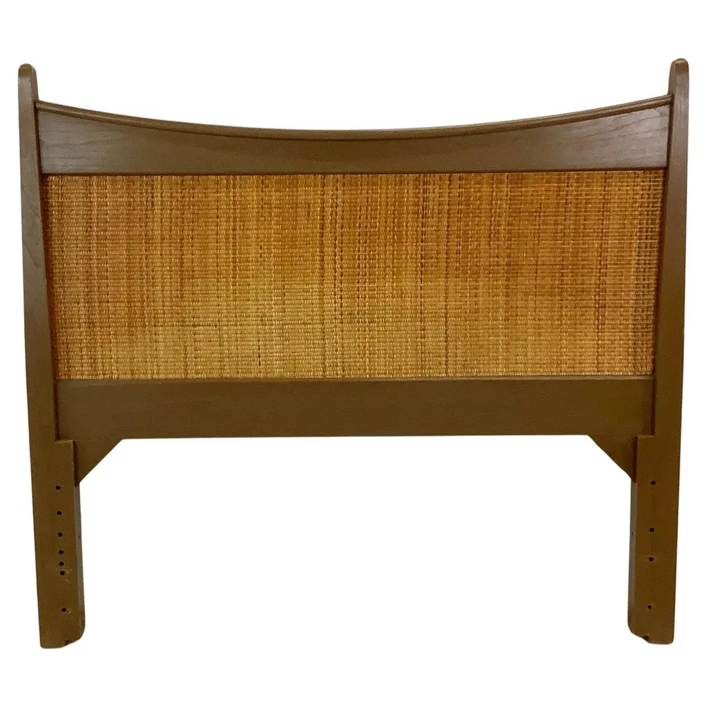 This beautifully restored Paul Frankl-inspired rattan headboard, inspired by the designs of Paul Frankl, this exquisite piece captures the essence of the Art Deco era. The headboard is crafted from a 12-strand horizontally stacked rattan design with double legs along the side. Perfect for a twin-size bed, it pairs effortlessly with modernist aesthetics while preserving its vintage charm.Rattan is more than just furniture—it's a statement of style, uniqueness, and timeless elegance. Frequently featured in home design magazines and advertisements worldwide, rattan's appeal lies in its ability to blend classic charm with contemporary aesthetics effortlessly.We take pride in offering the finest rattan available, showcasing expert craftsmanship through meticulously restored pieces built to last. Every item in our collection is revitalized with precision—wrappings repaired, connections reinforced, and a durable protective finish applied. Paired with fresh, perfectly fitted cushions, our rattan furniture delivers unparalleled comfort and beauty for your home or workspace. We have almost 100 years of expertise and know how to properly refinish and fully strengthen your rattan furnitureOur high-resolution photos capture the flawless condition and timeless style of each piece, highlighting rattan's enduring quality. With furniture that has stood the test of time—lasting 60 to 100 years—and now expertly restored to endure another 75, our collection represents both heritage and innovation. Stylish, unique, and versatile, rattan furniture remains a timeless choice, perfect for any setting.Harvey Schwartz is the leading expert in vintage rattan and the author of "Rattan Furniture: Tropical Comfort Throughout the Home." Signed copies are available for 39.99 USD. The hardbound 160-page full-color book details the fascinating History of rattan with photos of wonderful vintage and modern-day tropical décors and rattan. The book is great for any newcomer to rattan wanting to learn as well as a top resource for dealers and designers alike.We fully guarantee your complete satisfaction!Each rattan piece has been meticulously restored by seasoned artisans, ensuring durability and beauty for years to come. The warm natural finish and flowing contours bring a sense of organic elegance, making this headboard a standout addition to your bedroom.Available- 2It fits a mattress measuring 38" x 75".Dimensions:Overall: 29" H x 33"W 3"LWidth inside of headboard: 28"5 WFrom leg to bottom headboard: 13" HUnited States, 1930