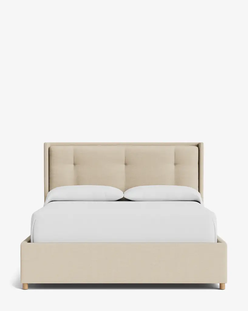 With a bench-made frame, the Ria Bed Low Headboard is customizable in a selection of our favorite high-quality fabrics. The tufted headboard brings both simplicity and elegance to bedroom designs in each of the colorways. With a low frame and subtle wood block feet, this upholstered bed elevates your bedroom style with its detail and refinement.