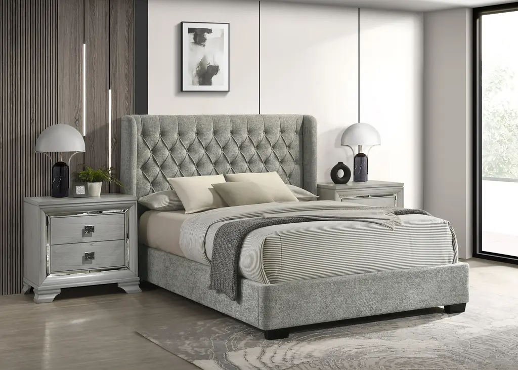 Soft Tweed Fabric Winged Headboard Bed - Gray / King