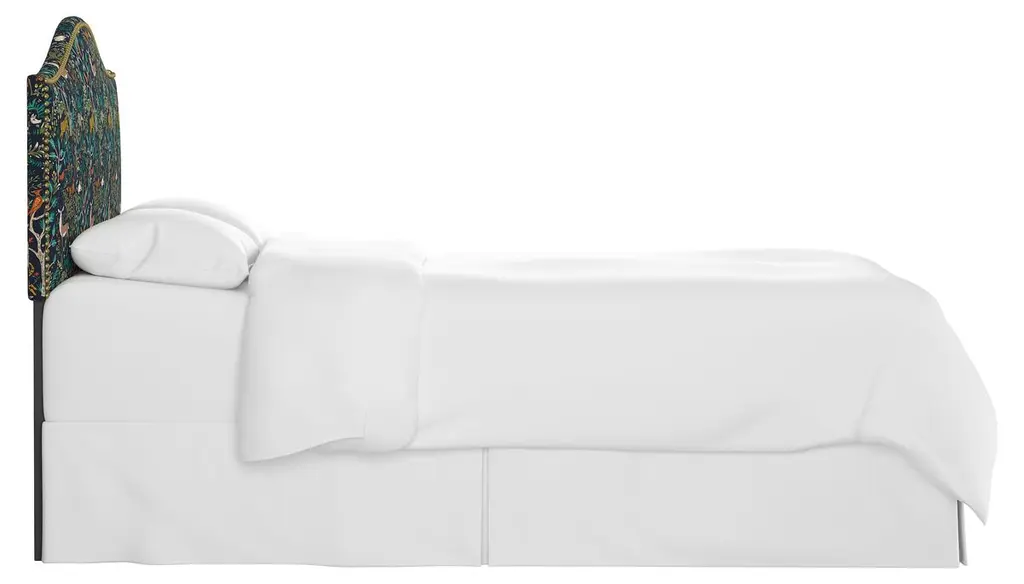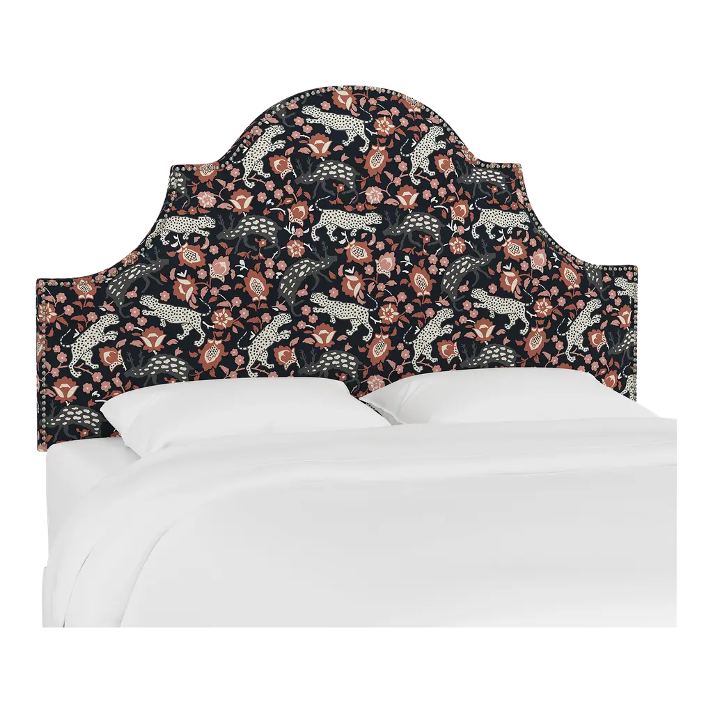 Beautifully enhanced by a trail of gleaming nailheads, this headboard boasts a lively pattern and classic camelback silhouette. Attaches to any standard bed frame. Handcrafted in the USA.