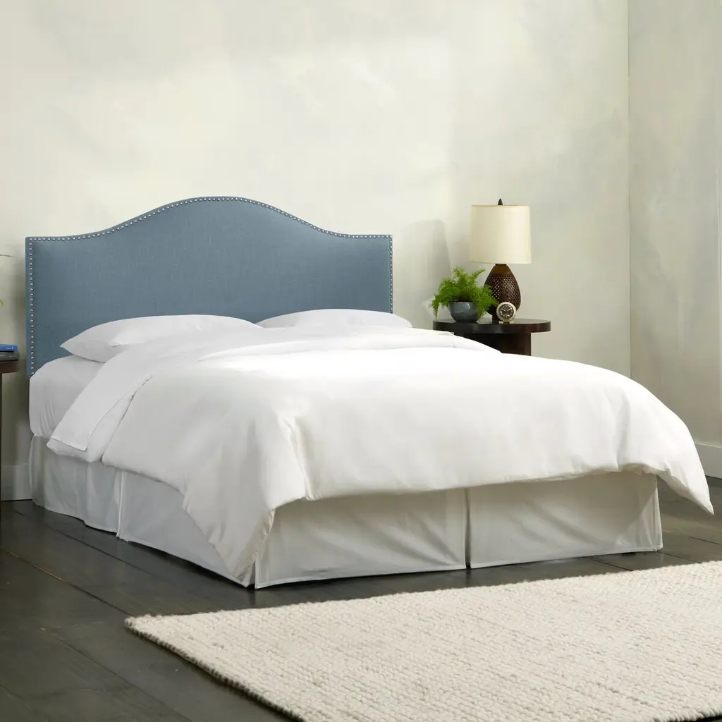 A One Kings Lane exclusive: Upholstered in neutral linen-blend fabric, this headboard's smooth camelback silhouette is highlighted by a steel nailhead trim. We love how its generous padding offers soft, structured support for watching TV or reading in bed. Attaches to any standard bed frame. Handcrafted in the USA.