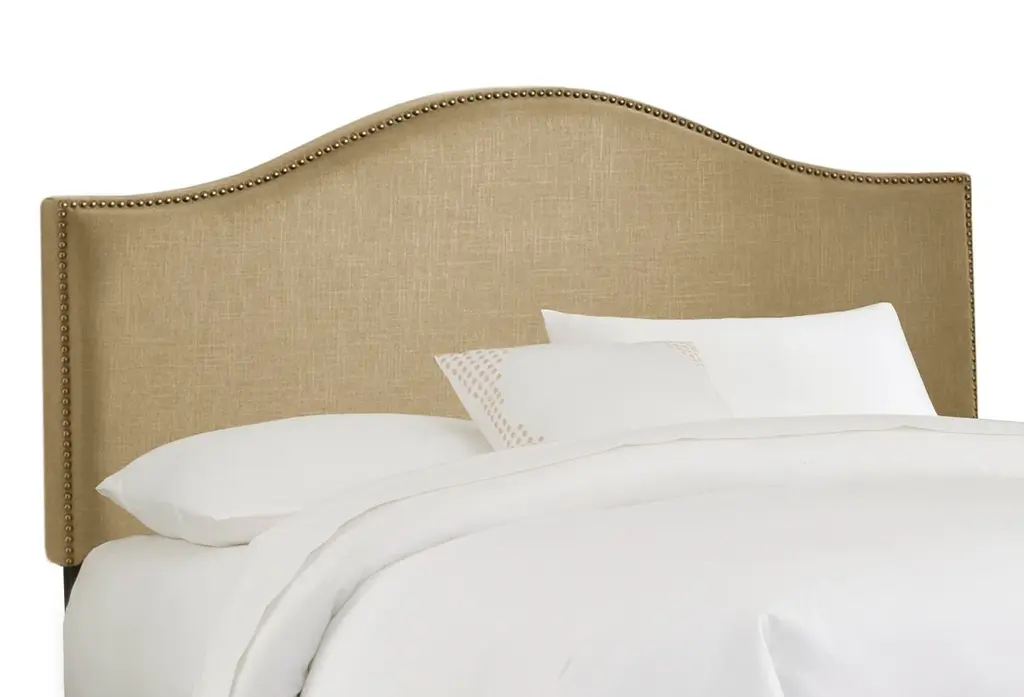 A One Kings Lane exclusive: Upholstered in neutral linen-blend fabric, this headboard's smooth camelback silhouette is highlighted by a steel nailhead trim. We love how its generous padding offers soft, structured support for watching TV or reading in bed. Attaches to any standard bed frame. Handcrafted in the USA.