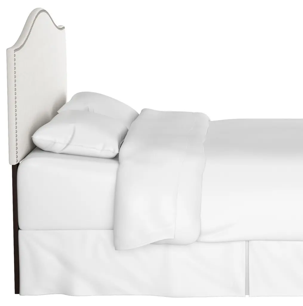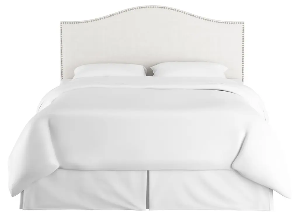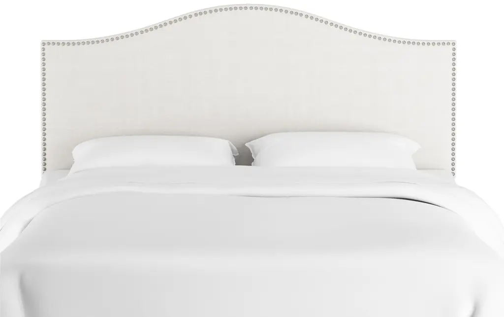 A One Kings Lane exclusive: Upholstered in neutral linen-blend fabric, this headboard's smooth camelback silhouette is highlighted by a steel nailhead trim. We love how its generous padding offers soft, structured support for watching TV or reading in bed. Attaches to any standard bed frame. Handcrafted in the USA.