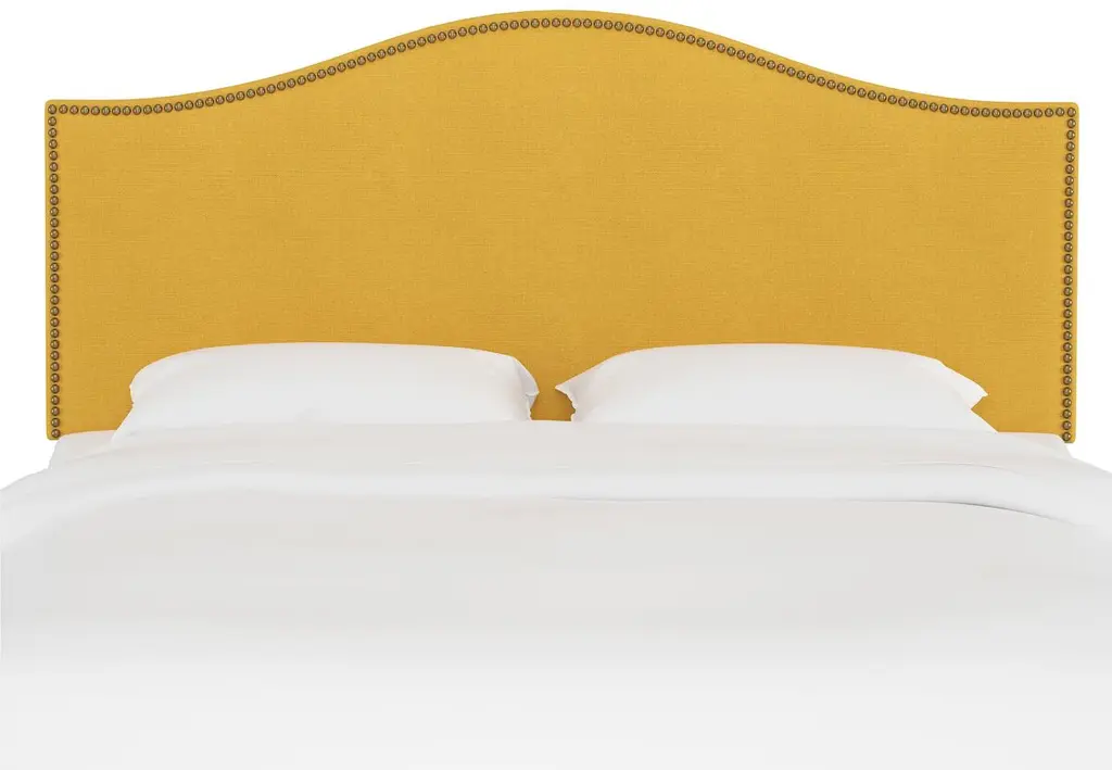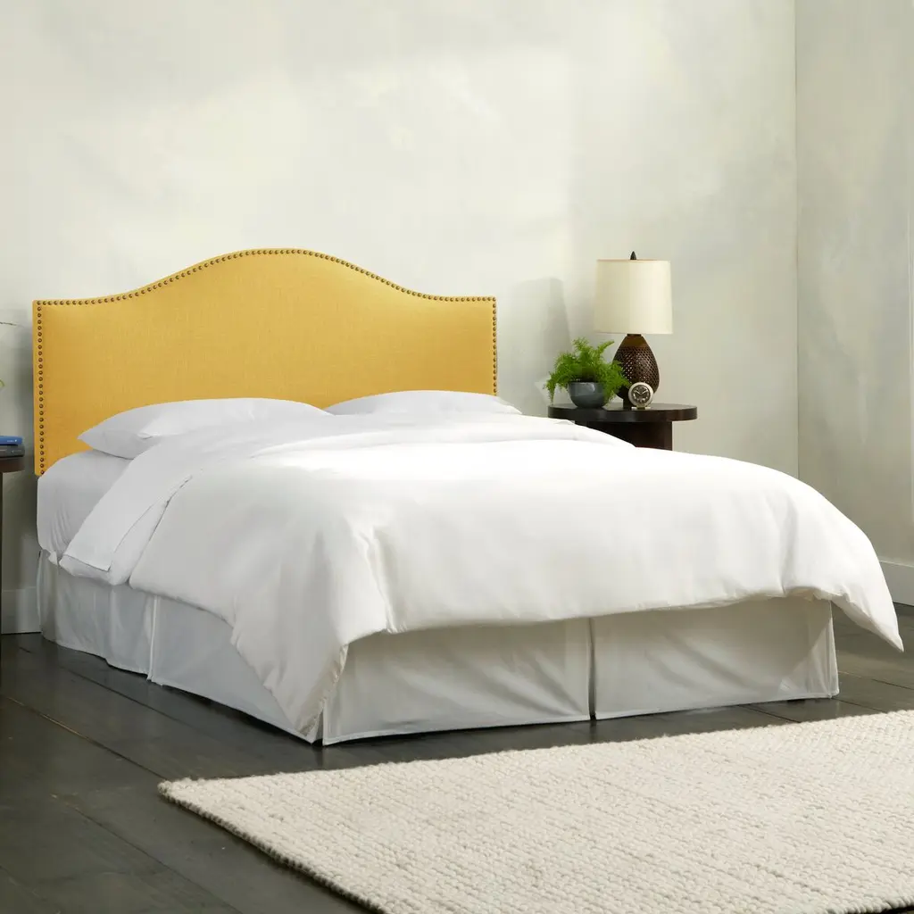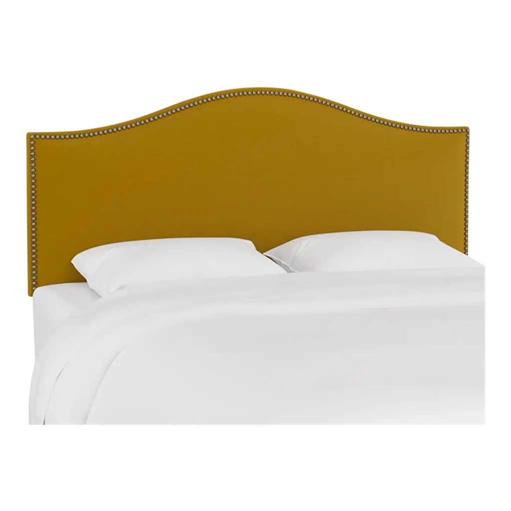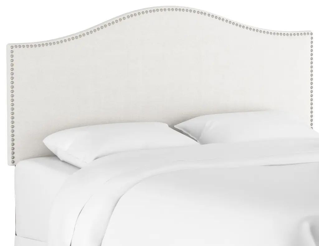 A One Kings Lane exclusive: Upholstered in neutral linen-blend fabric, this headboard's smooth camelback silhouette is highlighted by a steel nailhead trim. We love how its generous padding offers soft, structured support for watching TV or reading in bed. Attaches to any standard bed frame. Handcrafted in the USA.