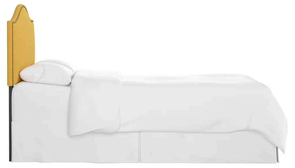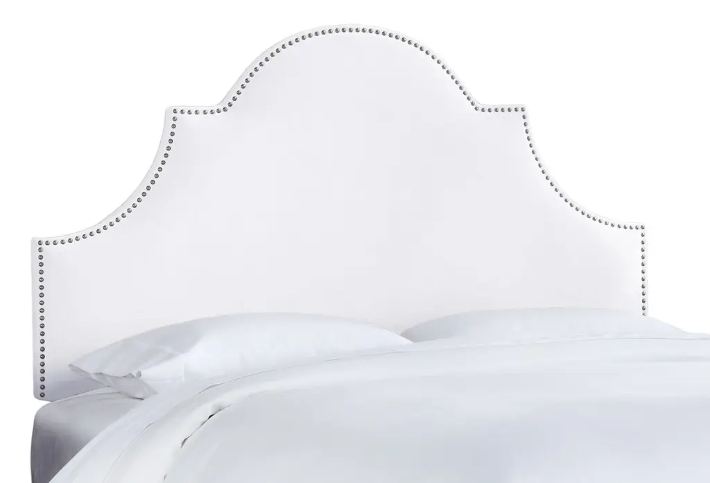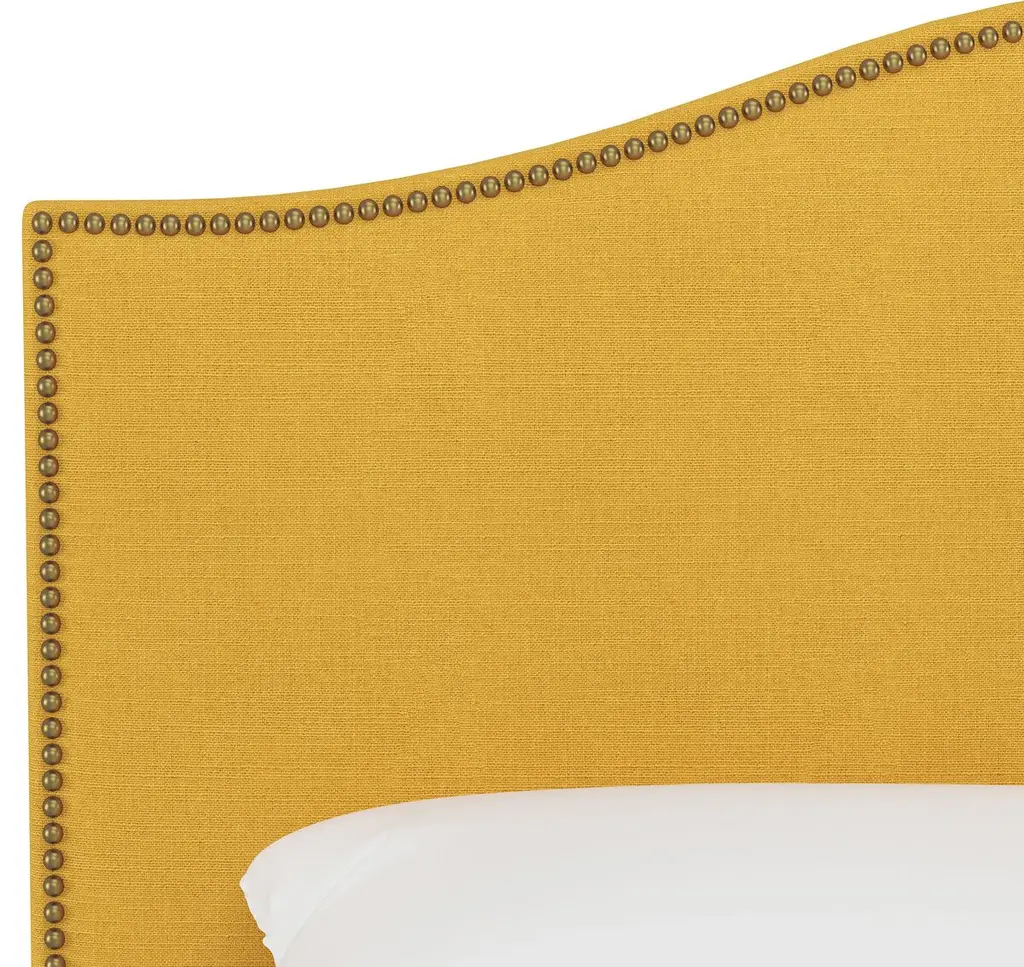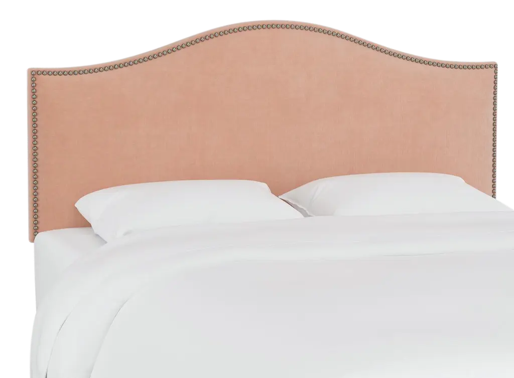 A One Kings Lane exclusive: Upholstered in neutral linen-blend fabric, this headboard's smooth camelback silhouette is highlighted by a steel nailhead trim. We love how its generous padding offers soft, structured support for watching TV or reading in bed. Attaches to any standard bed frame. Handcrafted in the USA.