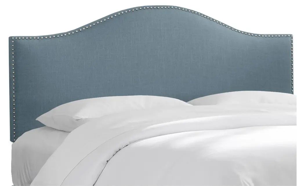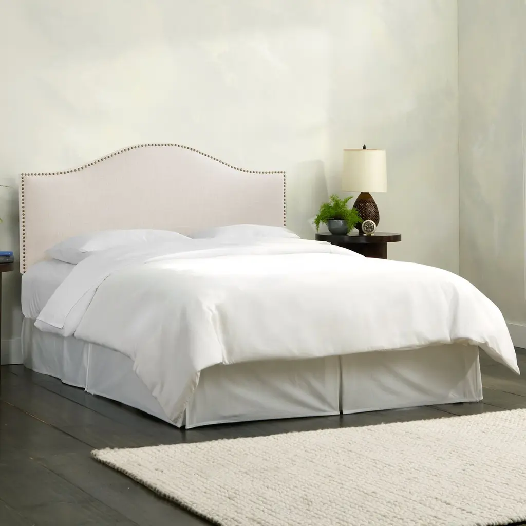 A One Kings Lane exclusive: Upholstered in neutral linen-blend fabric, this headboard's smooth camelback silhouette is highlighted by a steel nailhead trim. We love how its generous padding offers soft, structured support for watching TV or reading in bed. Attaches to any standard bed frame. Handcrafted in the USA.