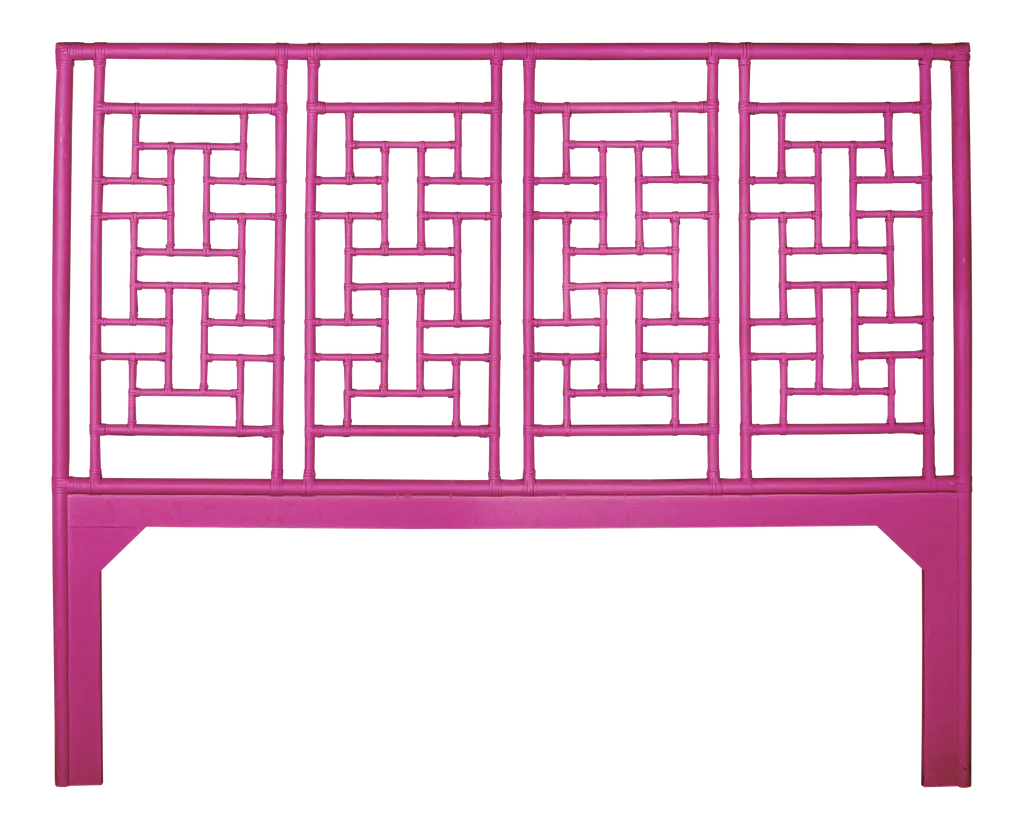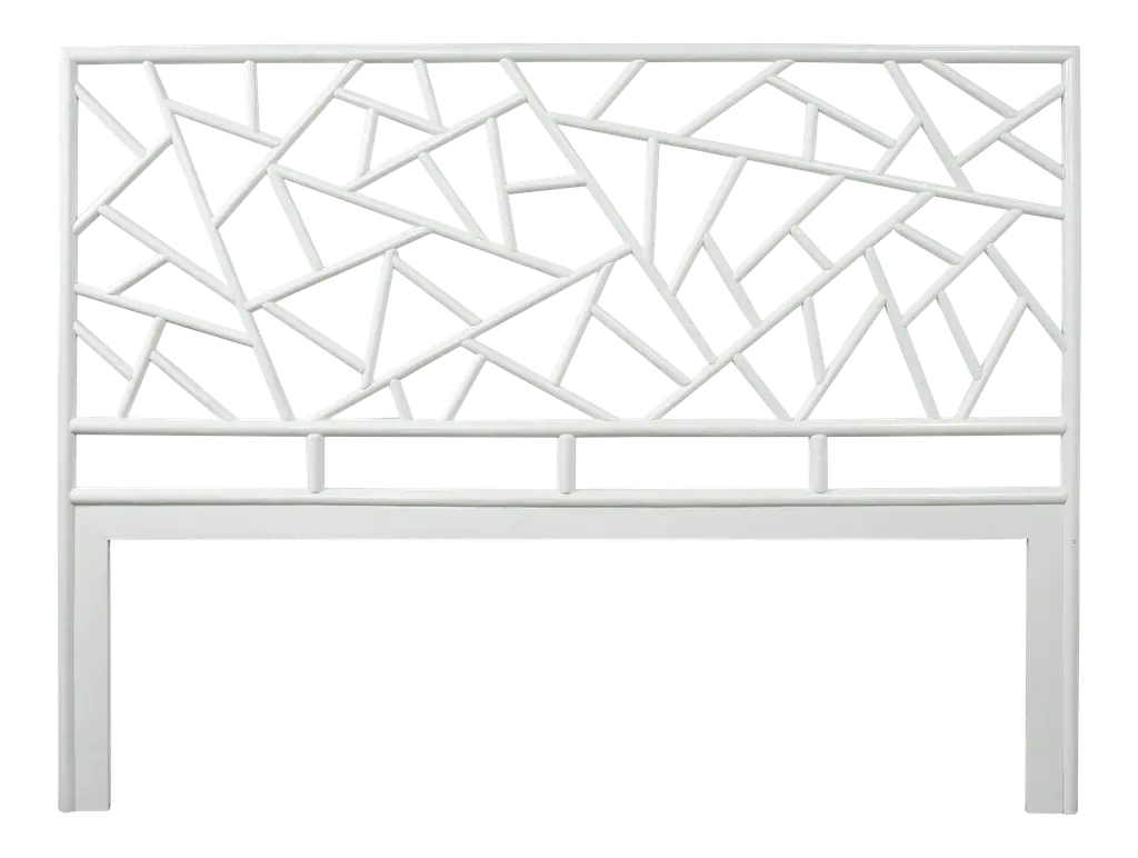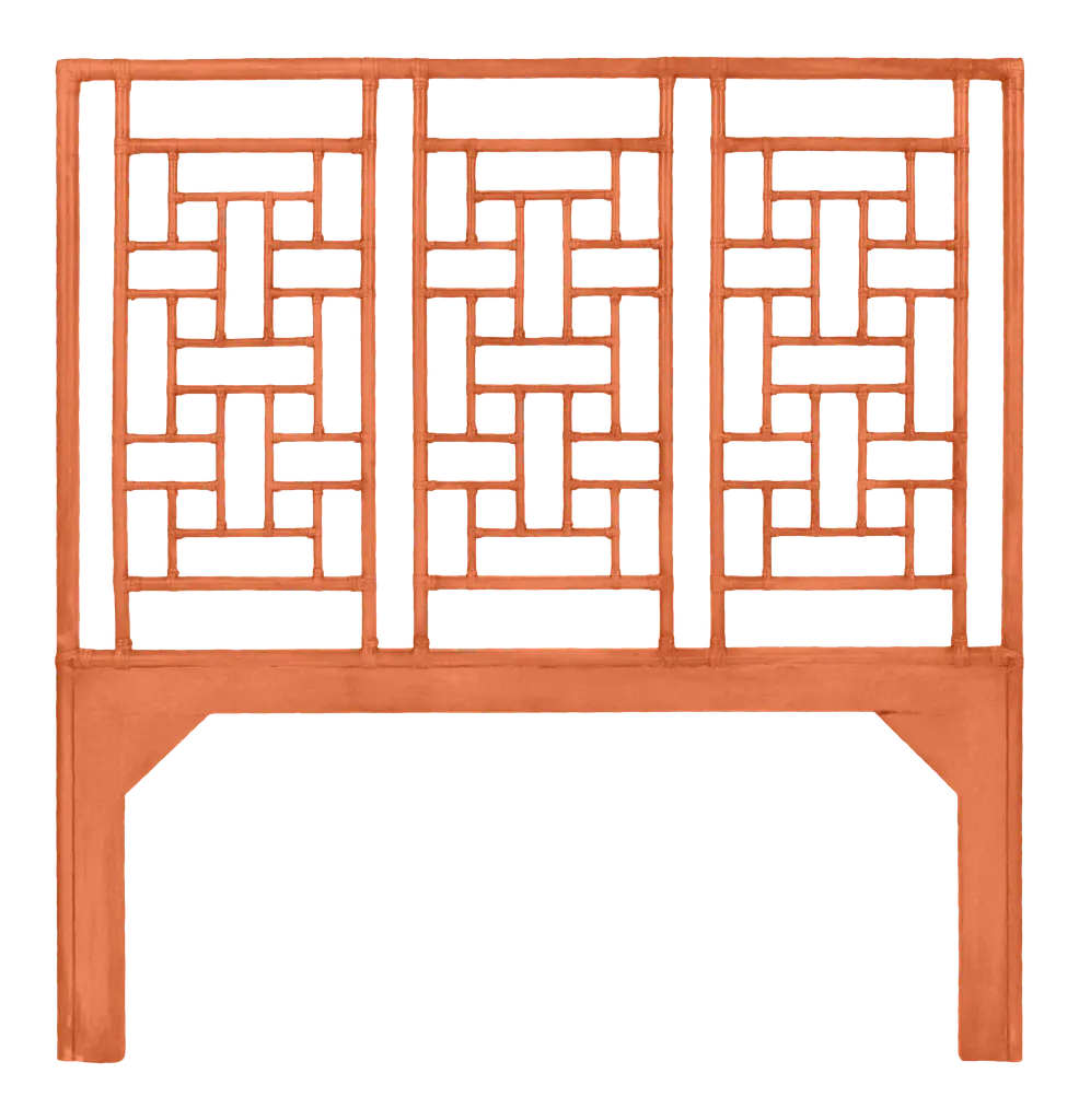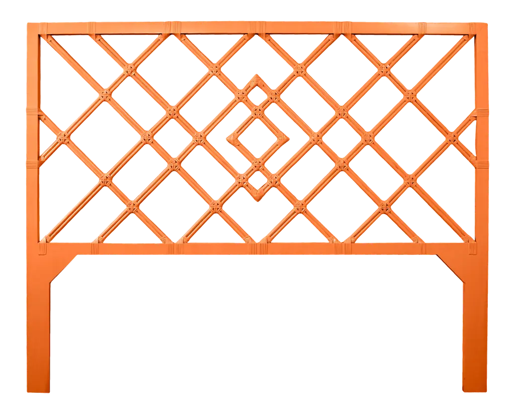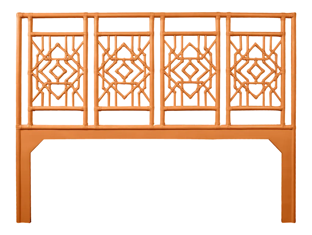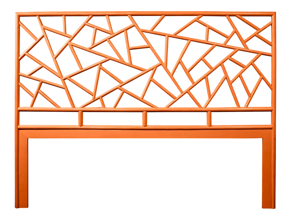 This headboard features classic Rattan design in a geometric pattern. Constructed of solid rattan and hand bound with rawhide bindings. This headboard can be attached to any standard bed frame or hung on the wall. Each headboard is hand finished in the USA and made to order, please allow time for delivery.