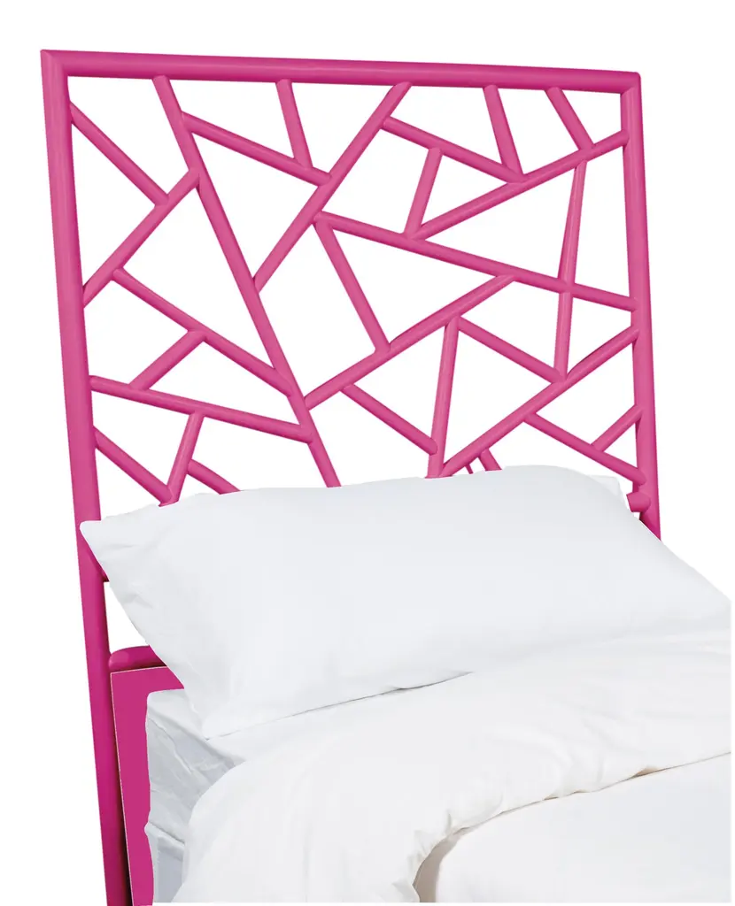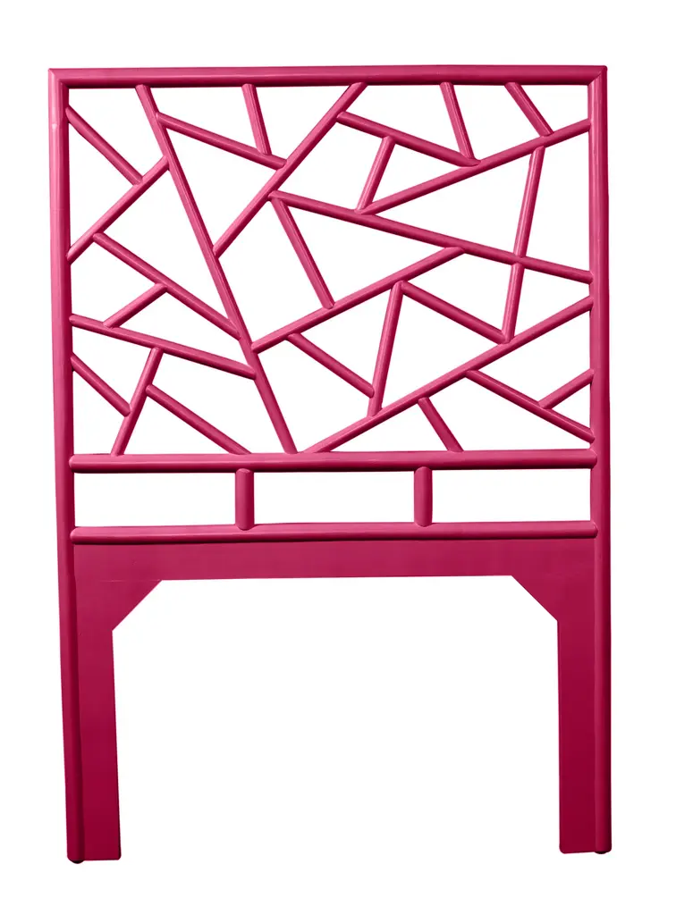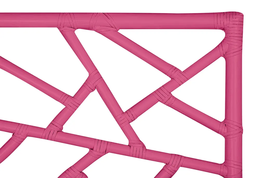 This headboard features classic Rattan design in a geometric pattern. Constructed of solid rattan and hand bound with rawhide bindings. This headboard can be attached to any standard bed frame or hung on the wall. Each headboard is hand finished in the USA and made to order, please allow time for delivery.