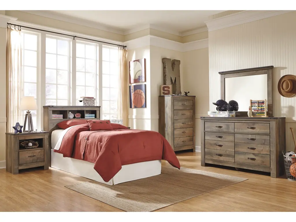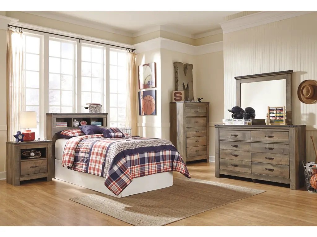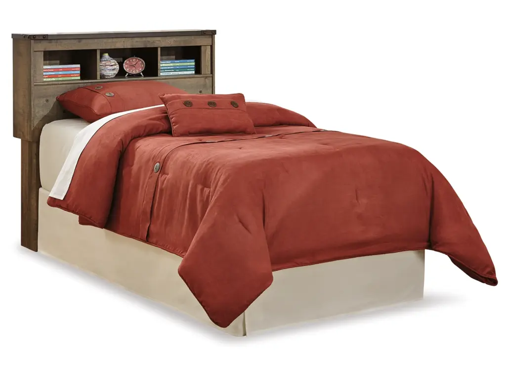 Whether she loves horses or he's a cowboy at heart, the Trinell twin bookcase headboard matches their authenticity. Its rustic finish, plank-style details and nailhead trim pay homage to reclaimed barn wood, making for a chic look loaded with charm. Mattress available, sold separately.
