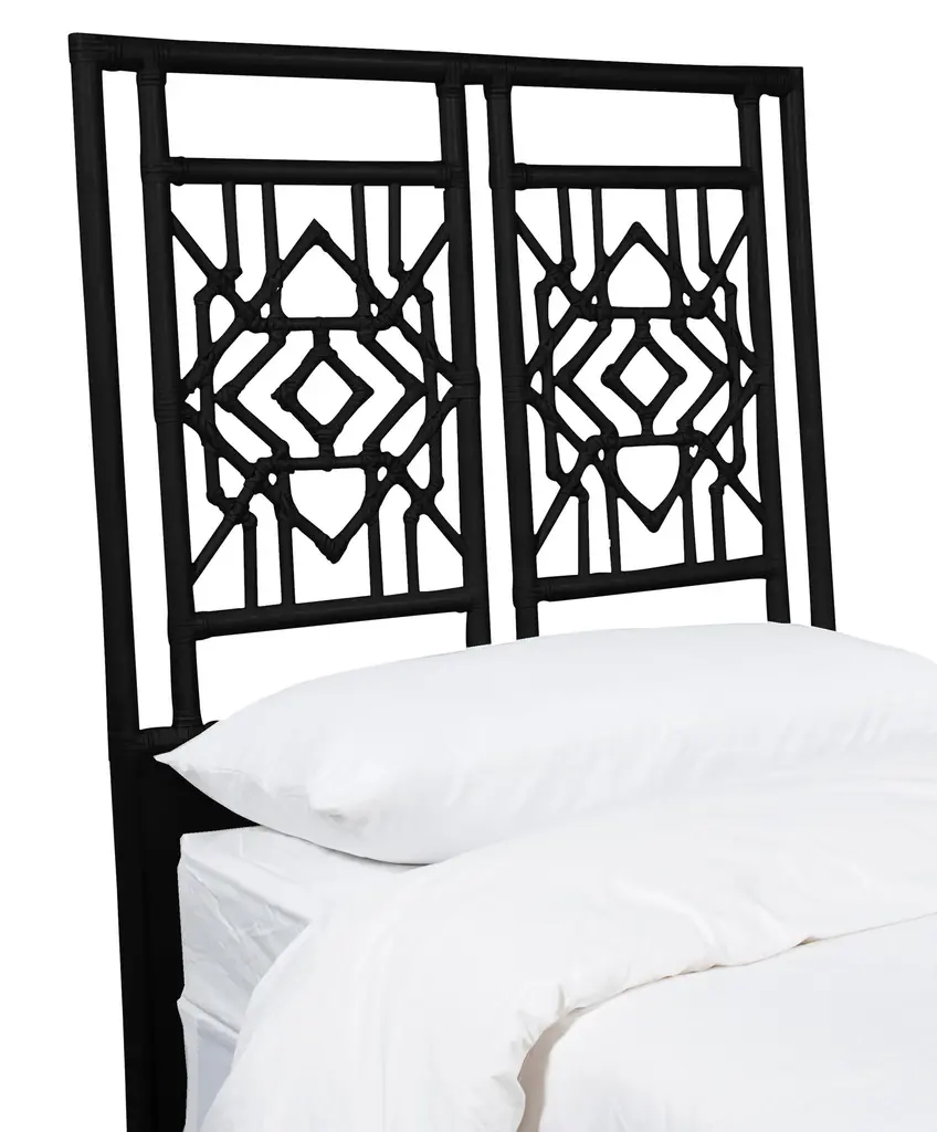 This headboard features classic Rattan design in a geometric pattern. Constructed of solid rattan and hand bound with rawhide bindings. This headboard can be attached to any standard bed frame or hung on the wall. Each headboard is hand finished in the USA and made to order, please allow time for delivery.