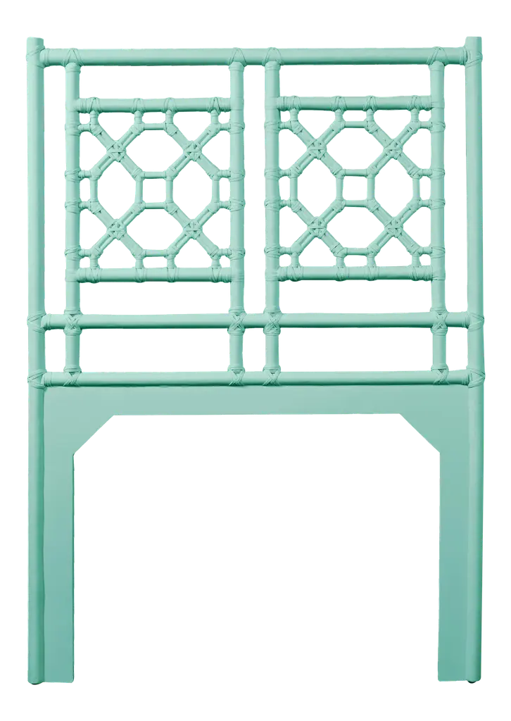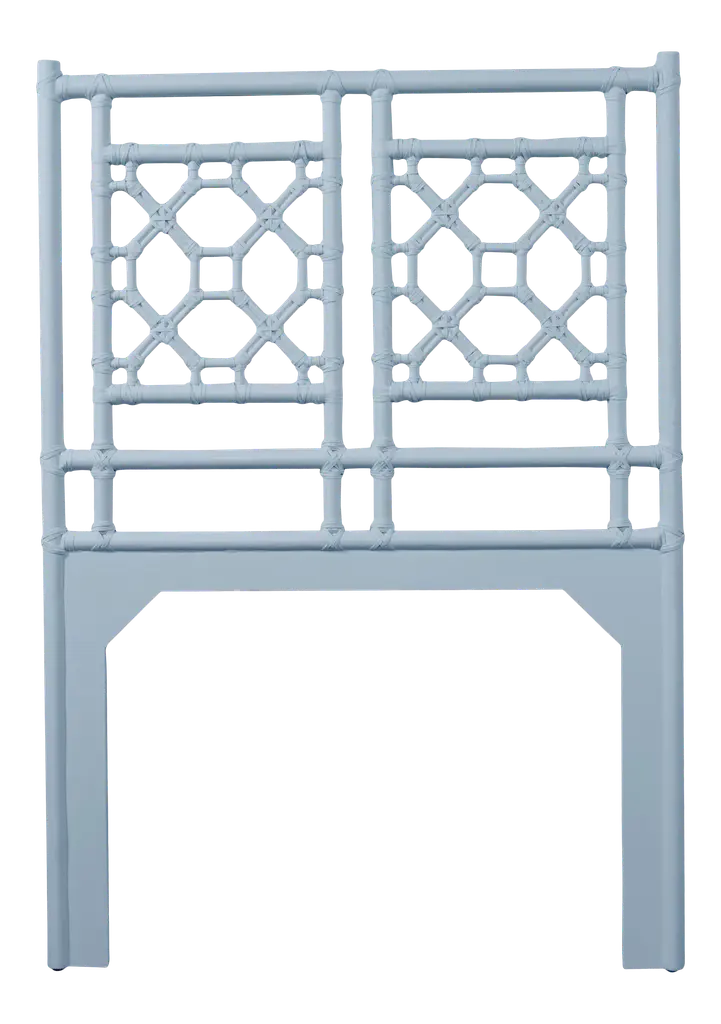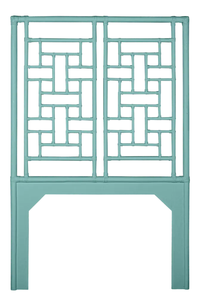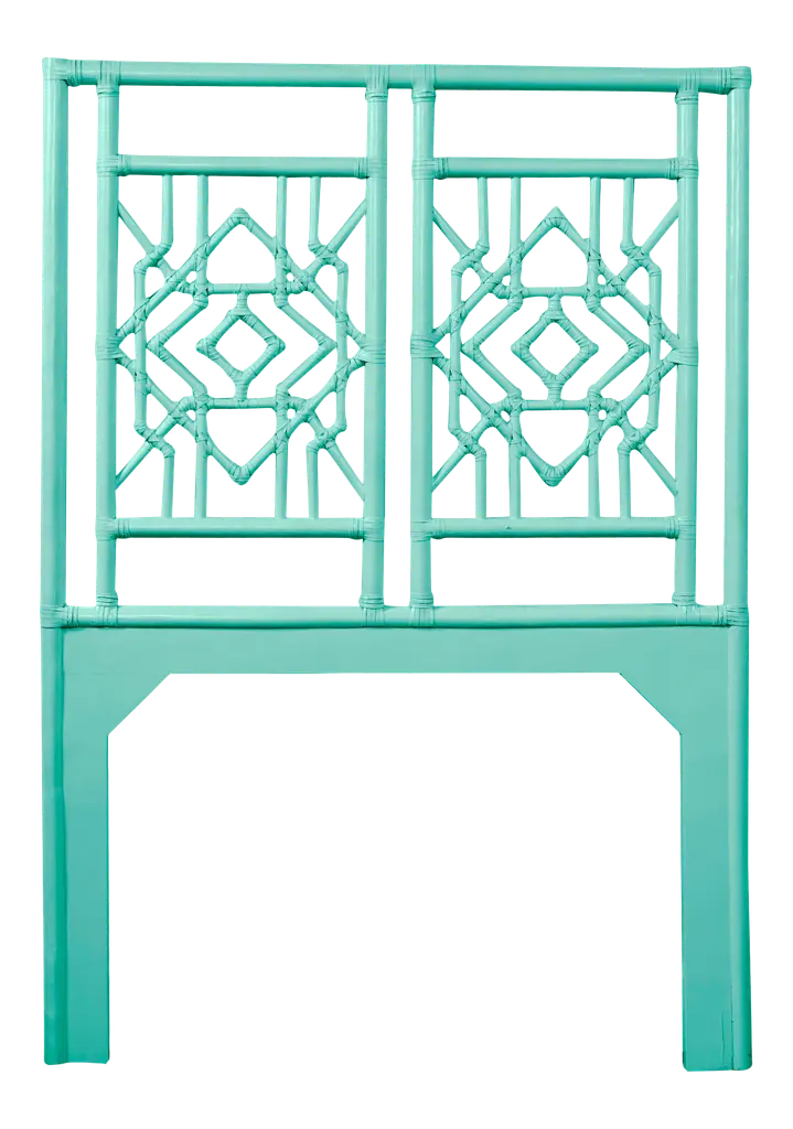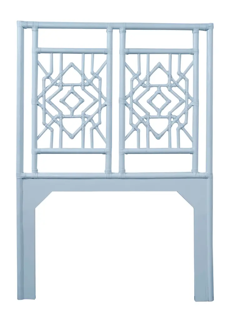 This headboard features classic Rattan design in a geometric pattern. Constructed of solid rattan and hand bound with rawhide bindings. This headboard can be attached to any standard bed frame or hung on the wall. Each headboard is hand finished in the USA and made to order, please allow time for delivery.
