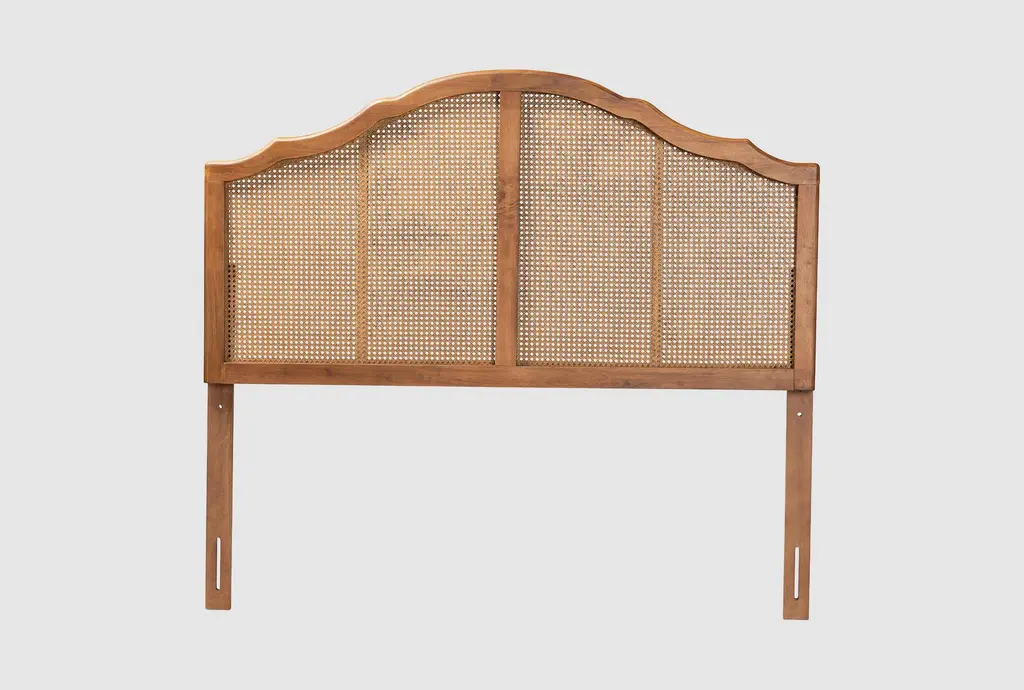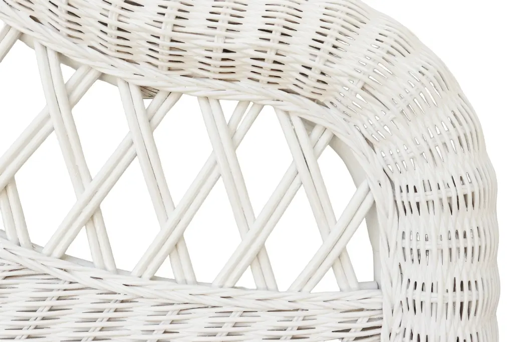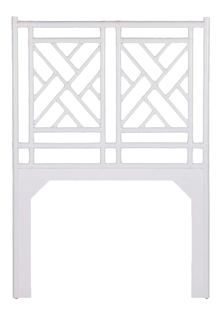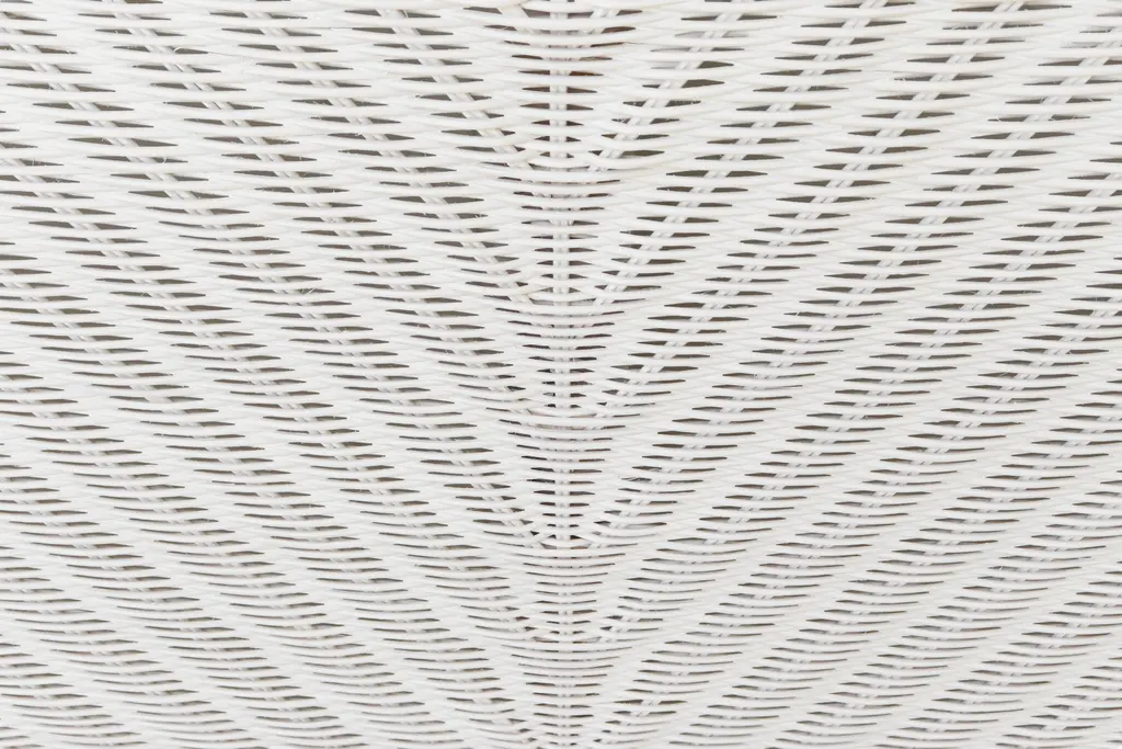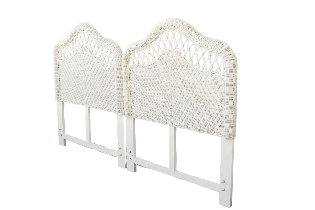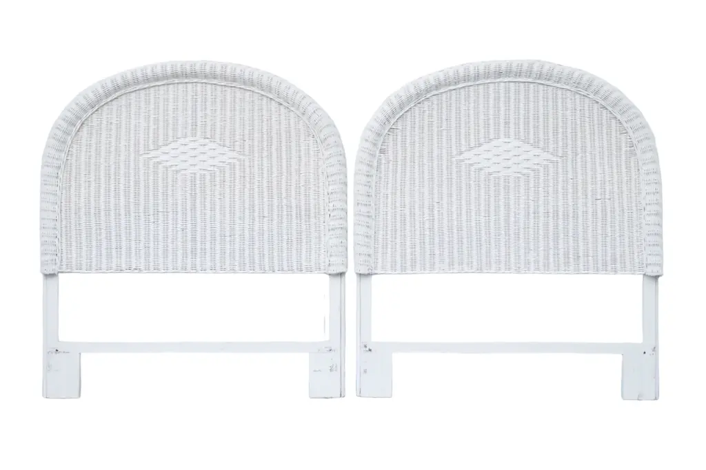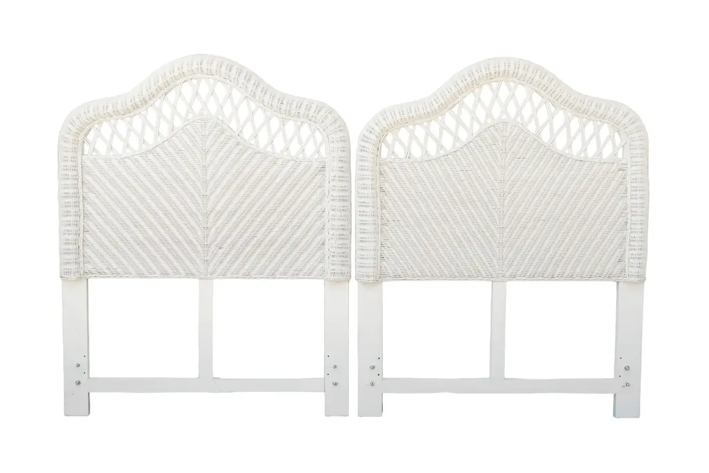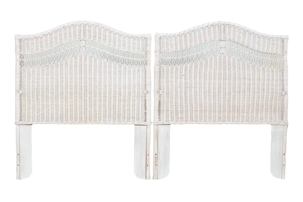 A pair of white Heywood Wakefield style twin size wicker headboards. Bentwood bamboo and wooden frames support curved woven rattan in a camel back shape. Decorated with an open weave panel above a chevron woven back. Finished with a twist braid trim and painted. Dimensions per headboard.