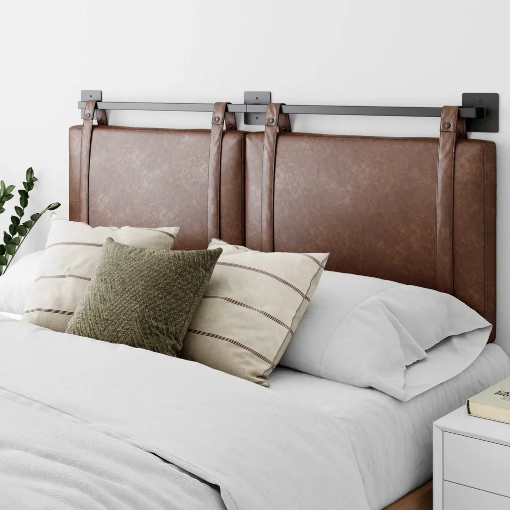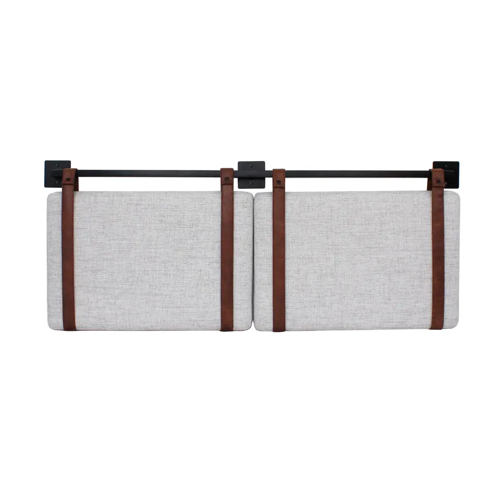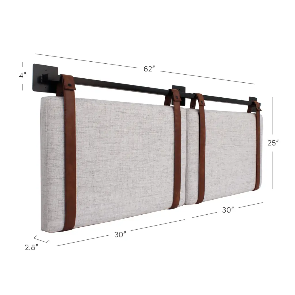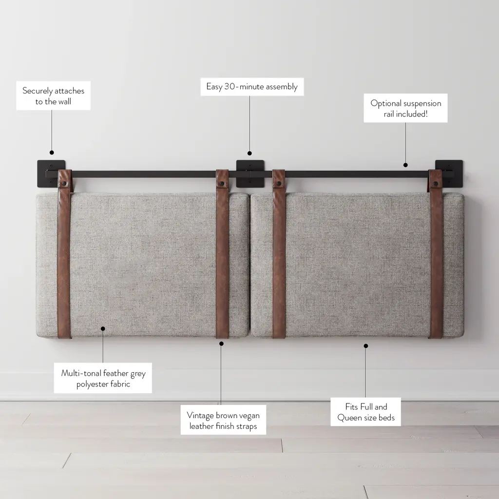 Meet Harlow. You’re not dreaming - you can elevate the look of your bed and add comfort without the commitment! Harlow is wall-mounted and easy to install. This headboard includes two lightweight panels upholstered with an airy feather grey linen-inspired fabric. Vintage brown vegan leather straps allow you to hang it with or without the included suspension rail (perfect for small spaces). Need to add some softness and style to a seating area? You can lean on Harlow. Hang these panels in an entry, dining, or banquette area behind a bench or a set of stools. Available in King/California King, Queen/Full, and Twin/Twin XL.