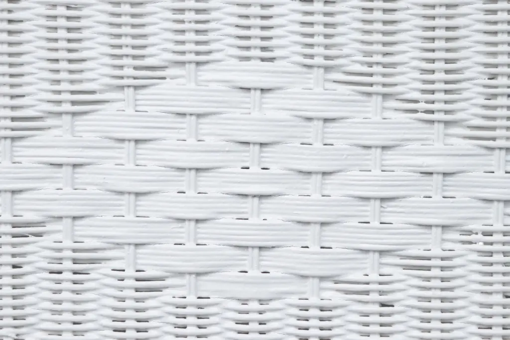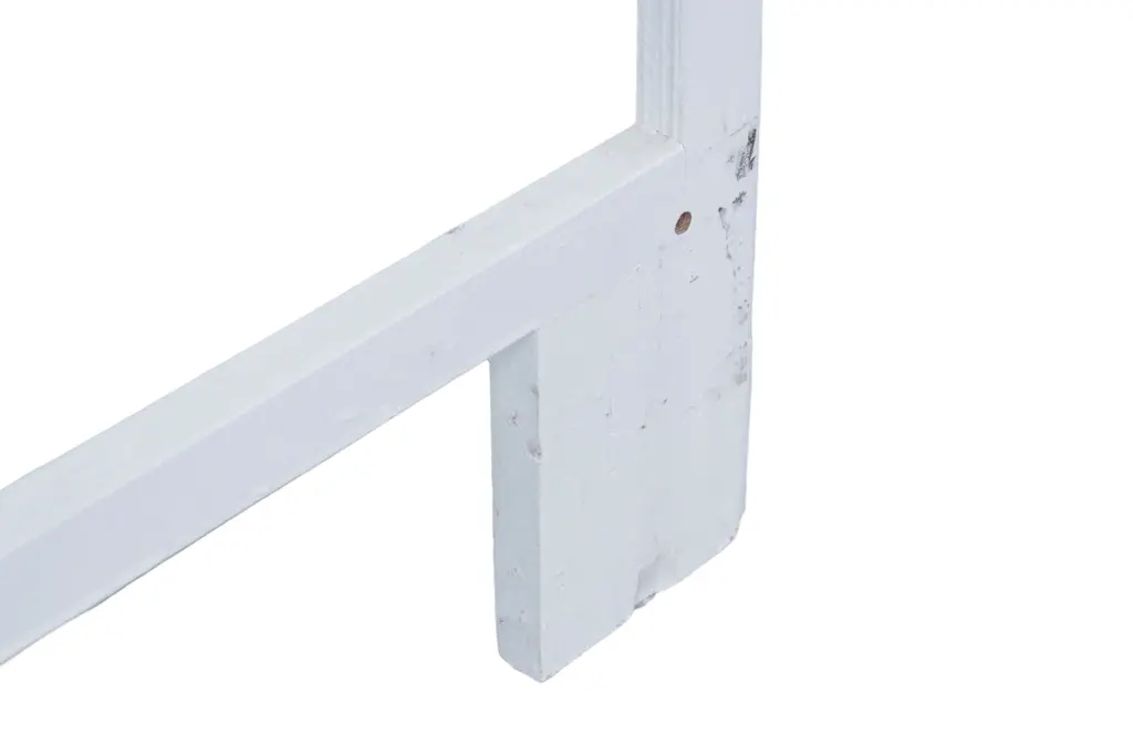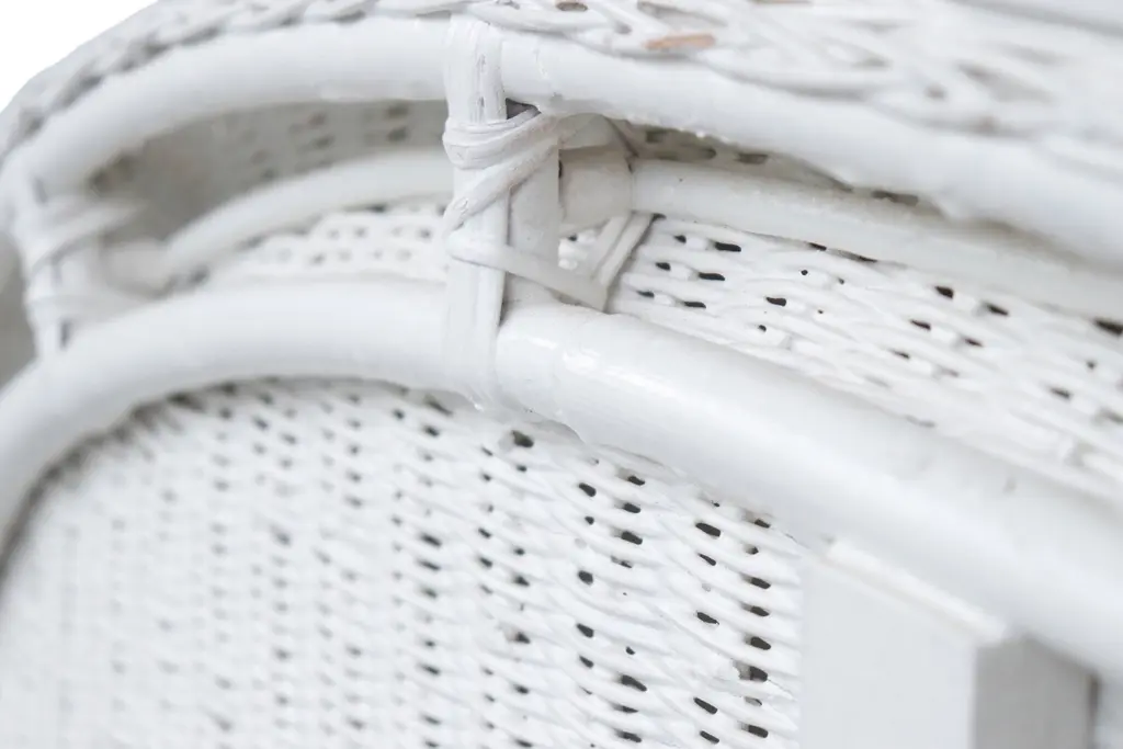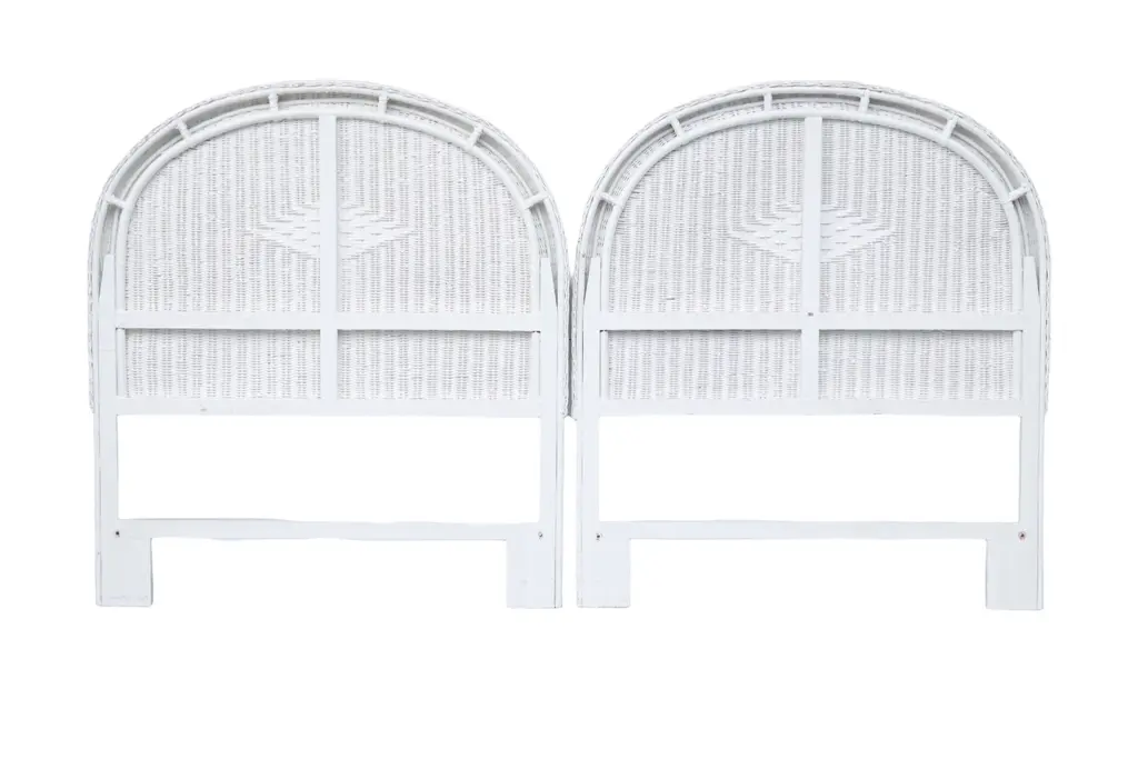 A pair of Heywood Wakefield style twin size rattan headboards. Bentwood frames support woven rattan in a gentle arched shape. Decorated in the center with a traditional Heywood Wakefield style diamond and finished with a rope-twist trim. Painted throughout in white. Dimensions per headboard.