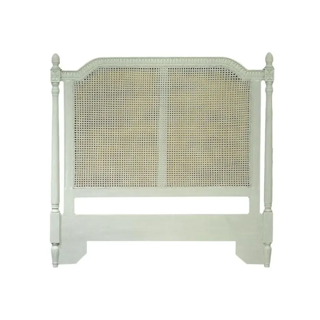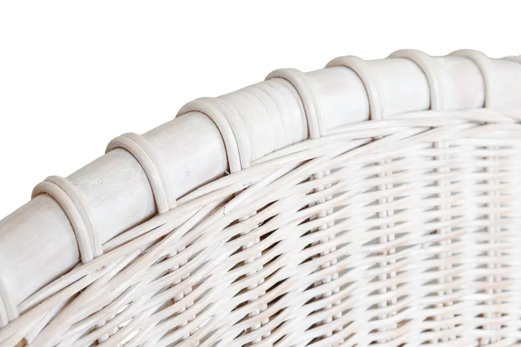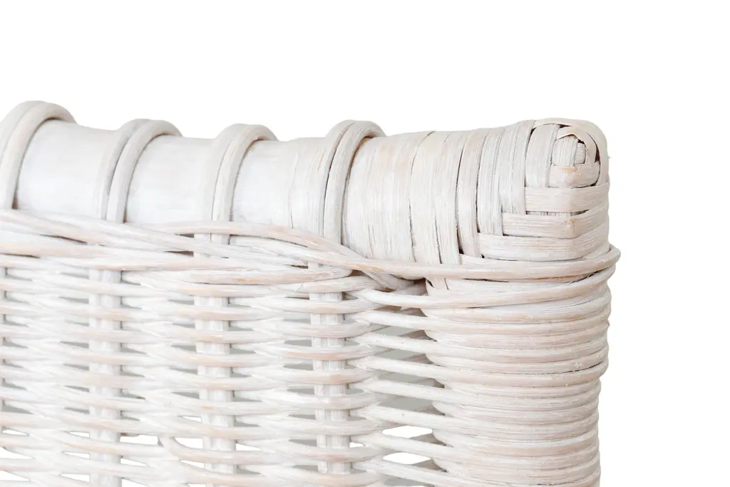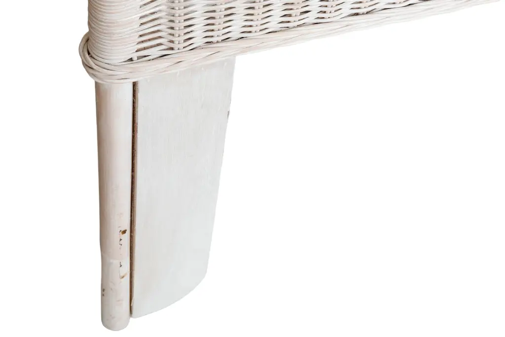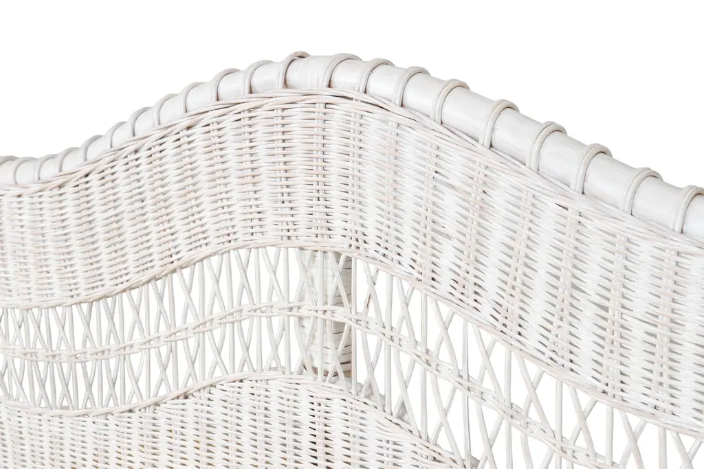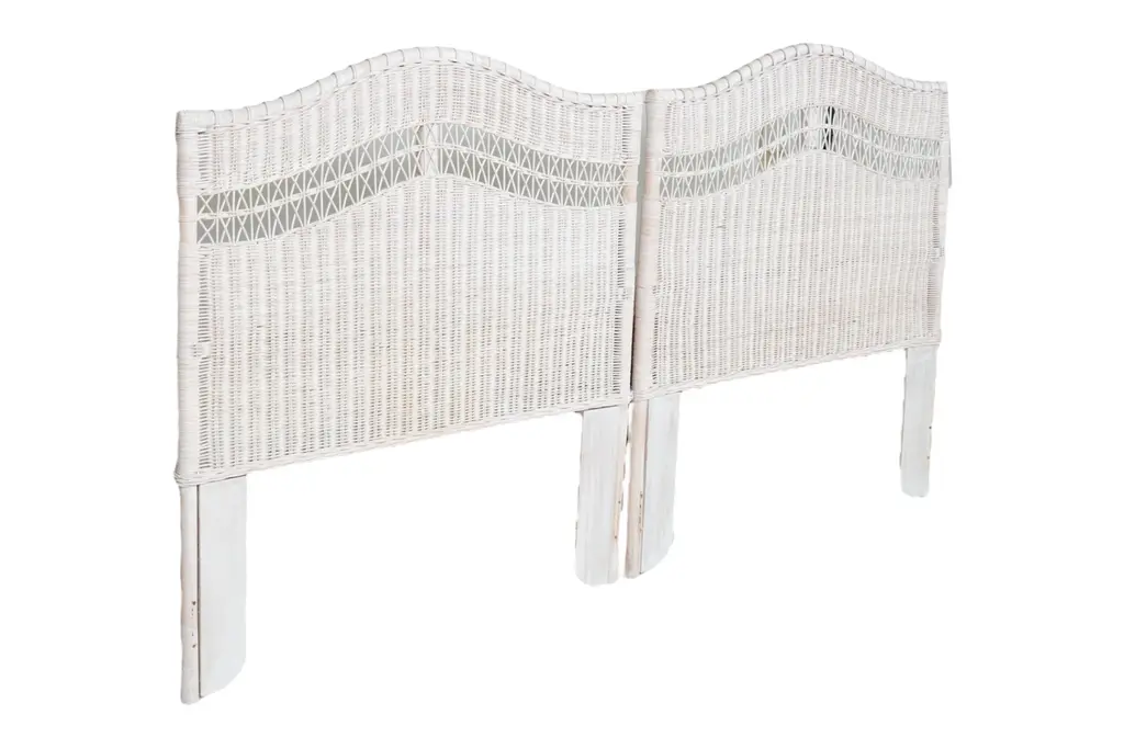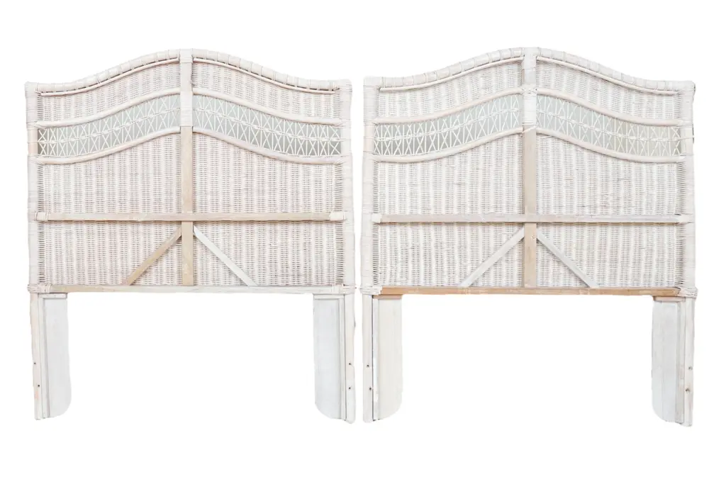 A pair of twin size whitewashed wicker headboards. Bentwood bamboo frames support woven rattan in a camel back shape. Decorated with open weave band, and trimmed with a braided edge. Dimensions per headboard.