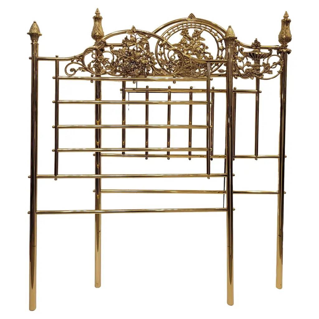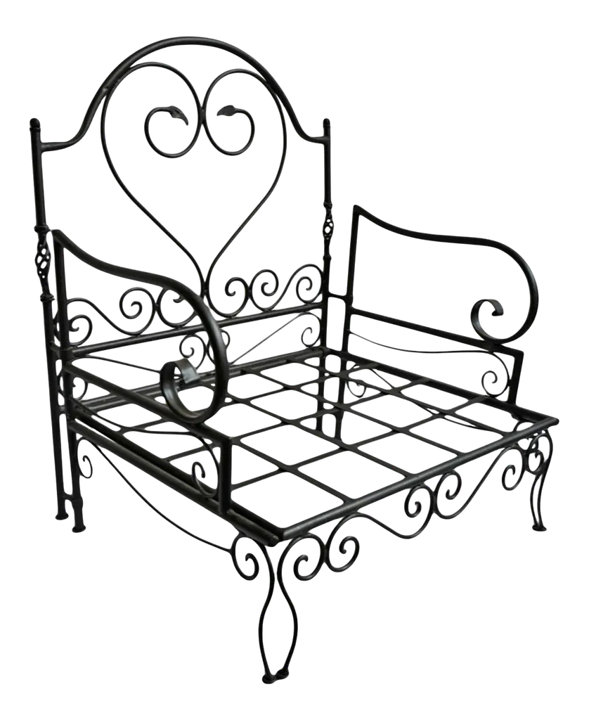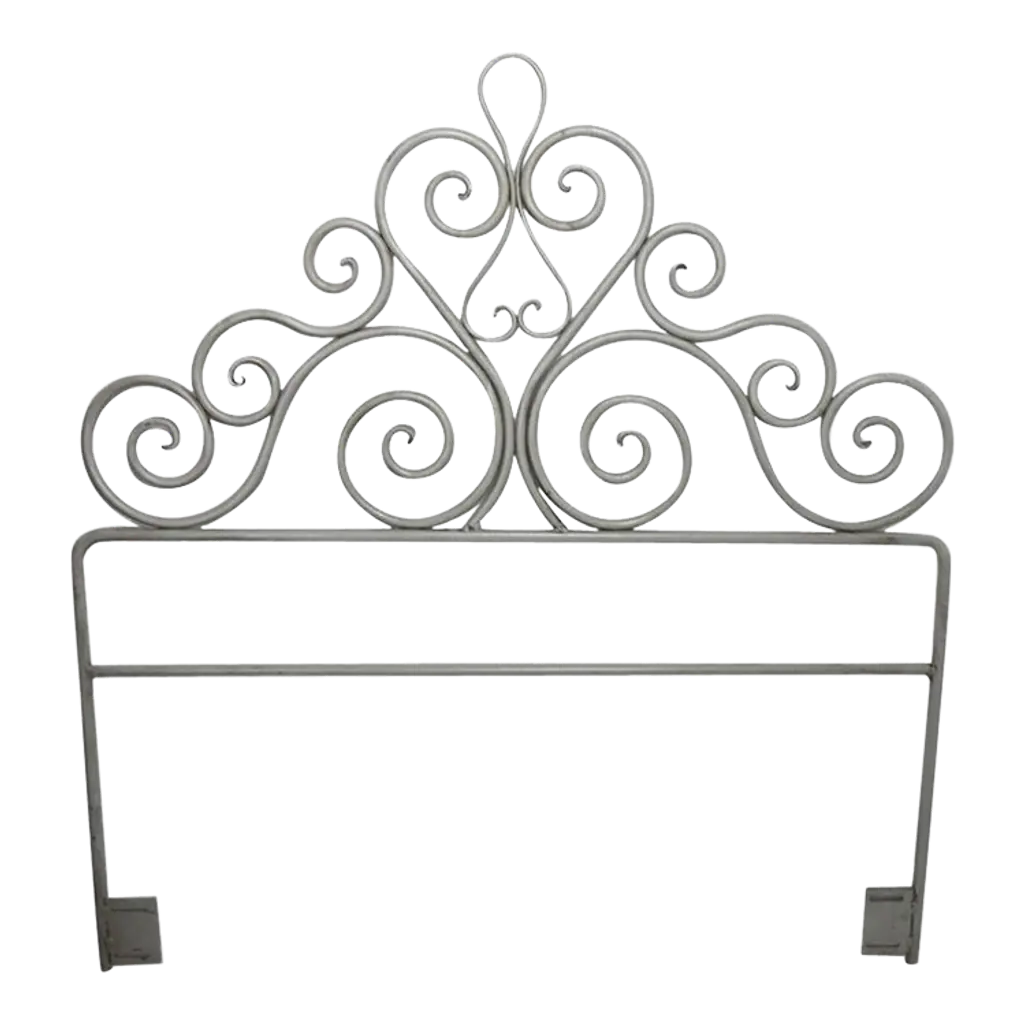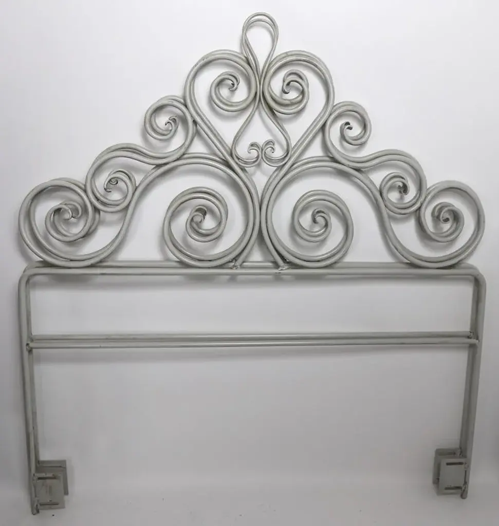 Well crafted pair of scrollwork wrought iron headboards suitable for twin size beds ( 44 inch total W. ) You can use these as two separate headboards by attaching a Hollywood frame to each, or create one bed / daybed by using one as a headboard and the other as a footboard. Priced and offered individually, but we would love to see them stay together. Height of decorative iron section of the bed 22 inch x total H 41 inch. Currently in original white paint finish, showing light cosmetic wear normal and consistent with age. We also offer custom powder coating if you prefer a more polished look.