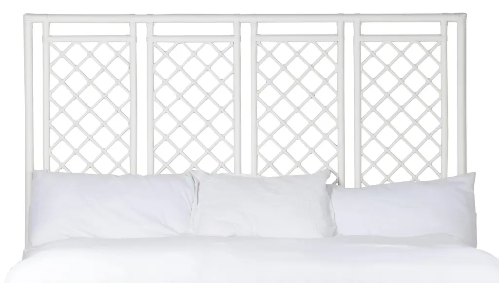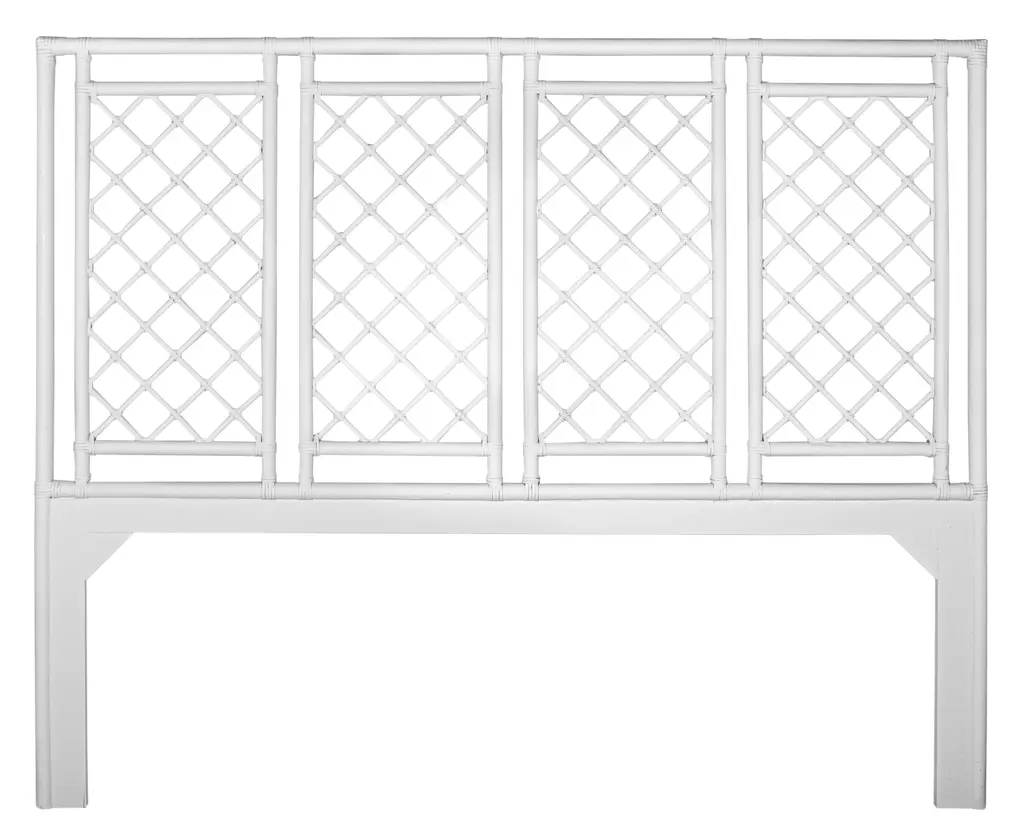 This headboard features classic Rattan design in a geometric pattern. Constructed of solid rattan and hand bound with rawhide bindings. This headboard can be attached to any standard bed frame or hung on the wall. Each headboard is hand finished in the USA and made to order, please allow time for delivery.