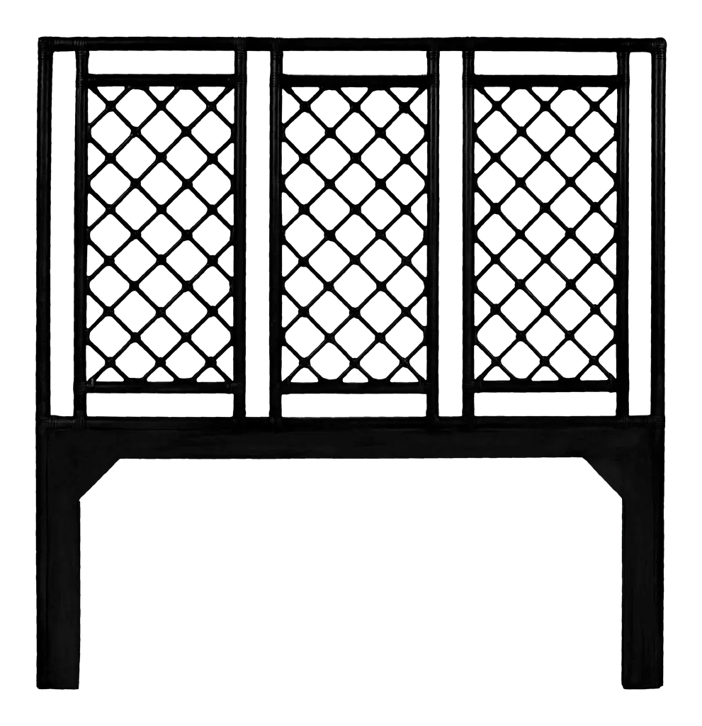 This headboard features classic Rattan design in a geometric pattern. Constructed of solid rattan and hand bound with rawhide bindings. This headboard can be attached to any standard bed frame or hung on the wall. Each headboard is hand finished in the USA and made to order, please allow time for delivery.